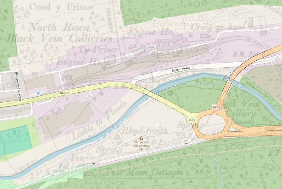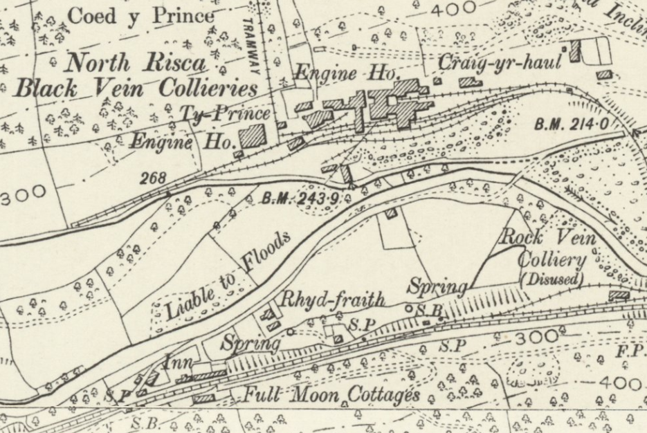 Remains of Full Moon Cottages (51.614945, -3.140519) are now part of the Sirhowy Valley Country Park (parking)/ The site of the cottages is about 300 feet/90 metres west along the path, about 30 metres before the toilets. The cottages would have lain to the south of the path which was the rail track, the inn to the north. The North Risca Colliery was 300 metres to the north east.