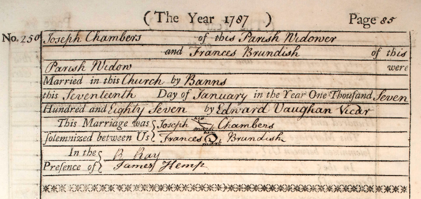 That leaves Joseph (II) as the most plausible candidate on circumstantial grounds. He and Frances were of the same generation, both born around 1714. There is also a social connection: Frances had previously been married to William Brundish the elder, whose son William Brundish the younger had married Sarah Chambers, a daughter of Joseph (II). Frances had therefore been the stepmother-in-law of Joseph (II)’s own daughter, exactly the kind of overlapping family network that often brought people together in a small village community.