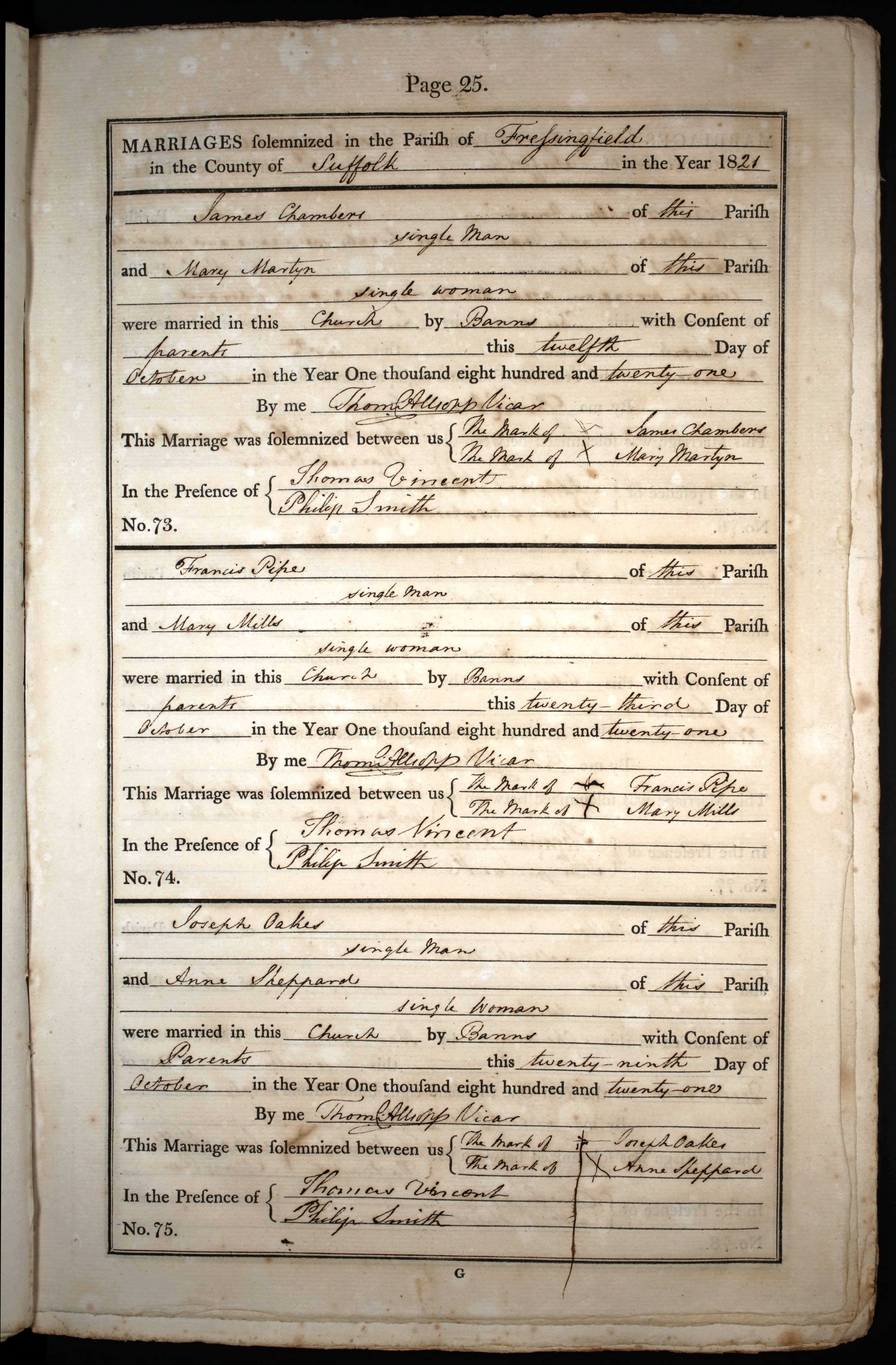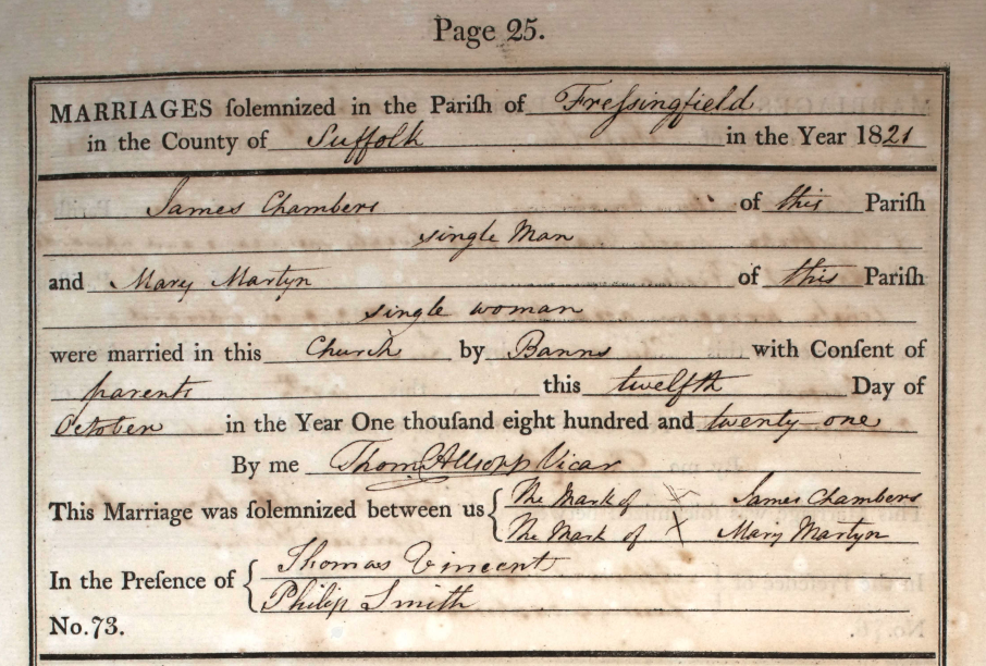 James married Mary Ann on the 12th October 1821 in Fressingfielda11. He was twenty-seven; she was twenty. Neither were able to sign their names. Since Mary was under the age of twenty-one the marriage entry notes that the pair had the consent of their parents to marry.