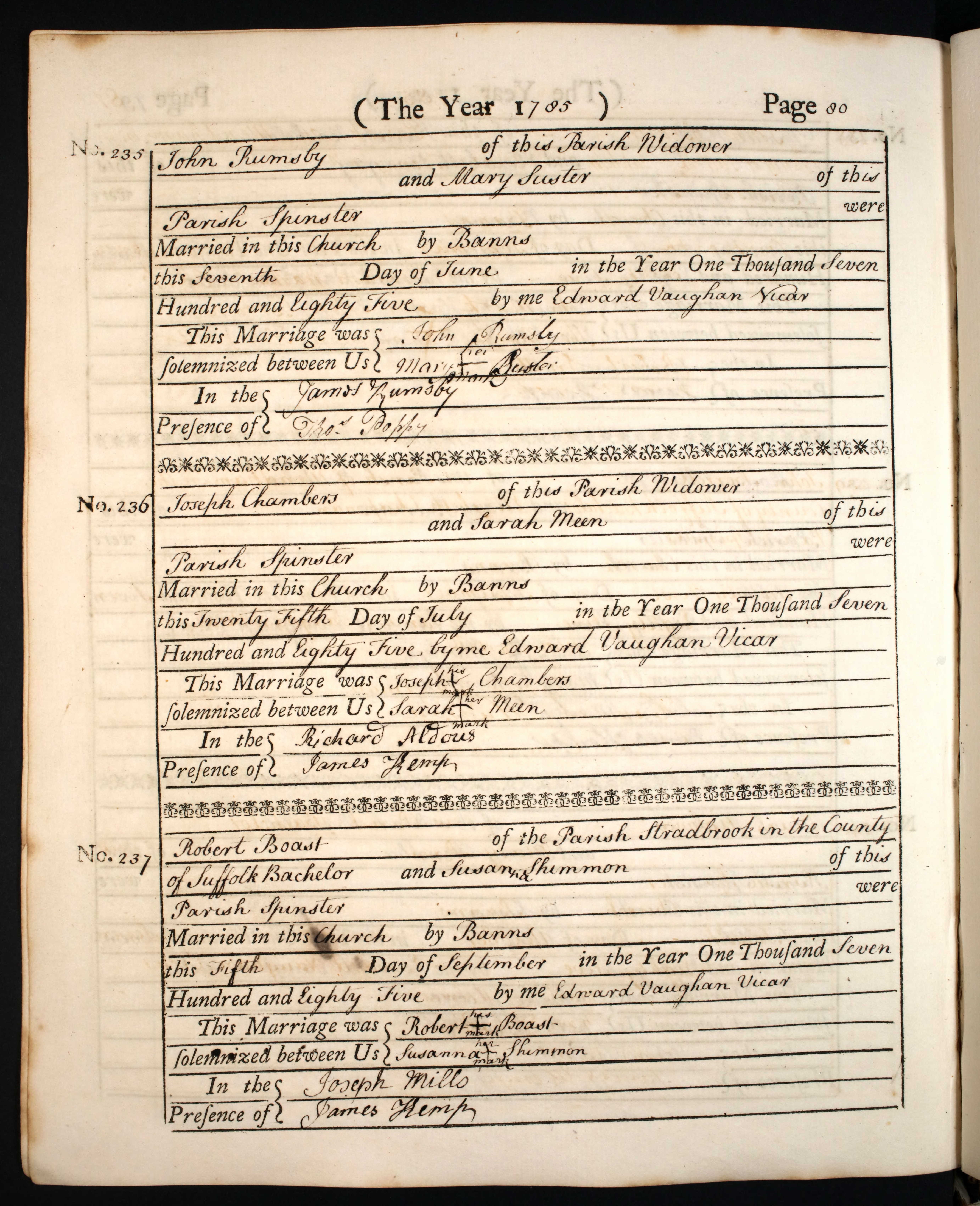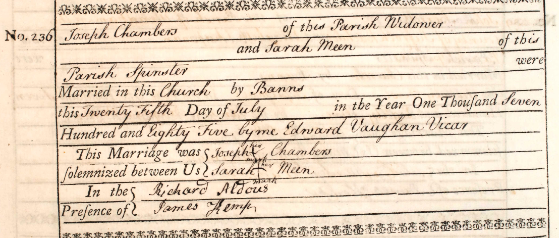 Joseph married Sarah Meen on the 25th July 1785 at St. Peter and St. Paul’s, Fressingfielda19. He was forty-six; she was thirty-three. For Joseph, it was a second marriage after three years as a widower. The register records Sarah as a spinster, confirming that this was her first marriage. At thirty-three she was somewhat older than the typical bride in rural England. The average age at first marriage for women in this period was around twenty-five or twenty-six though it was by no means uncommon for women to marry later, particularly if they had been working in service or supporting their own family beforehand. Neither bride nor groom could sign their names.