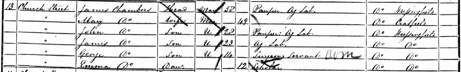 Their eldest, John, had left home and was working as a servant to Henry Newsom, an agricultural labourer in South Elmham St. Nicholasg6. Robert, aged seventeen, was living in the household of William Chatten, a farmer situated on Broad Road, now Laxfield Road, on the southern outskirts of the parishg5.
