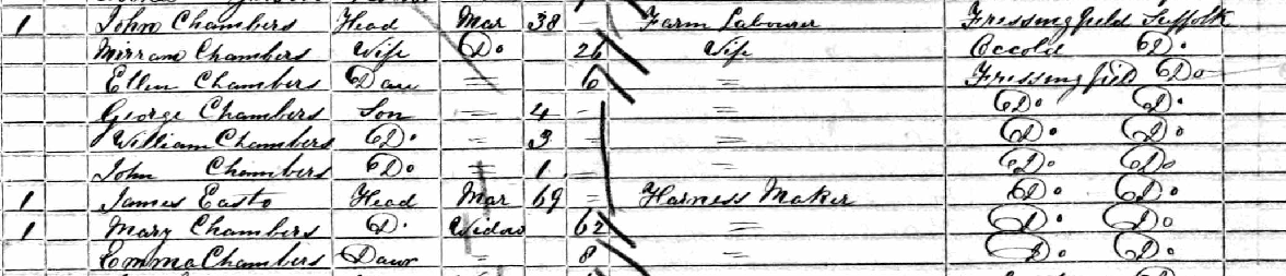 John, the eldest, remained in Fressingfield and married Marianne Denny on the 10th December 1854 at the parish churcha3. He followed his father into agricultural work and he and Marianne raised seven children, all born in the parish: Ellen (1855), George (1857), William (1858), John (1861), Charles (1863), Harry (1866), and Arthur (1870). He lived to the age of seventy-nine.