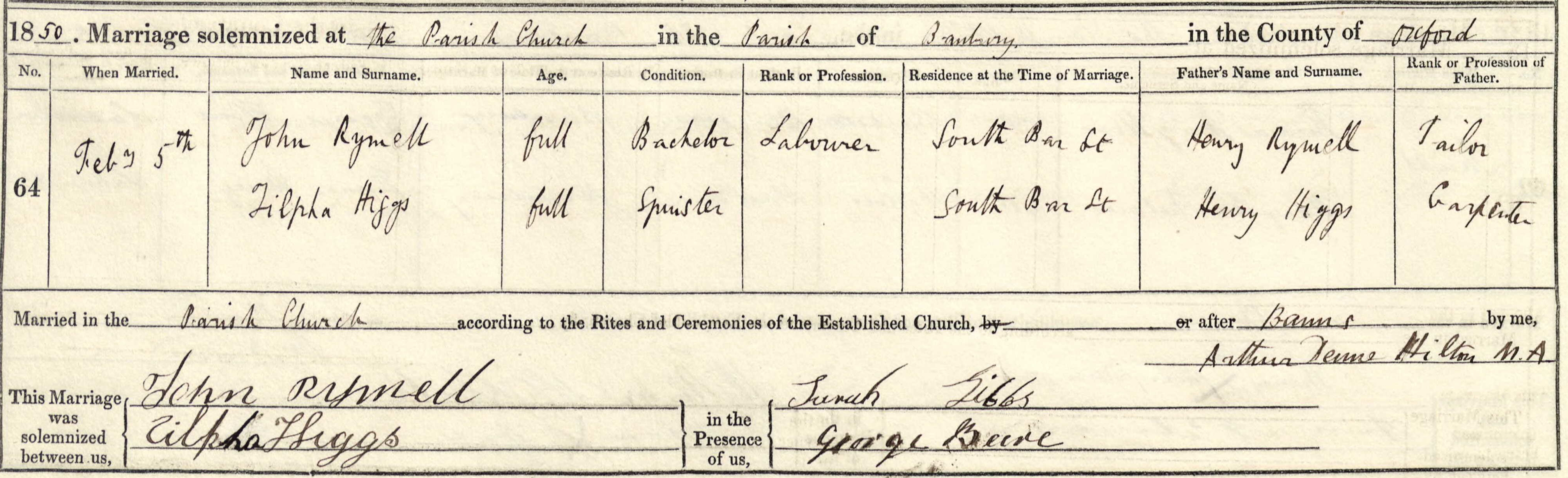 Parish Registers of St. Mary, Banbury, Oxfordshire; Marriage entry for John Rymell and Zilpha Higgs, 5 Jan 1850, Page 32, No 64.