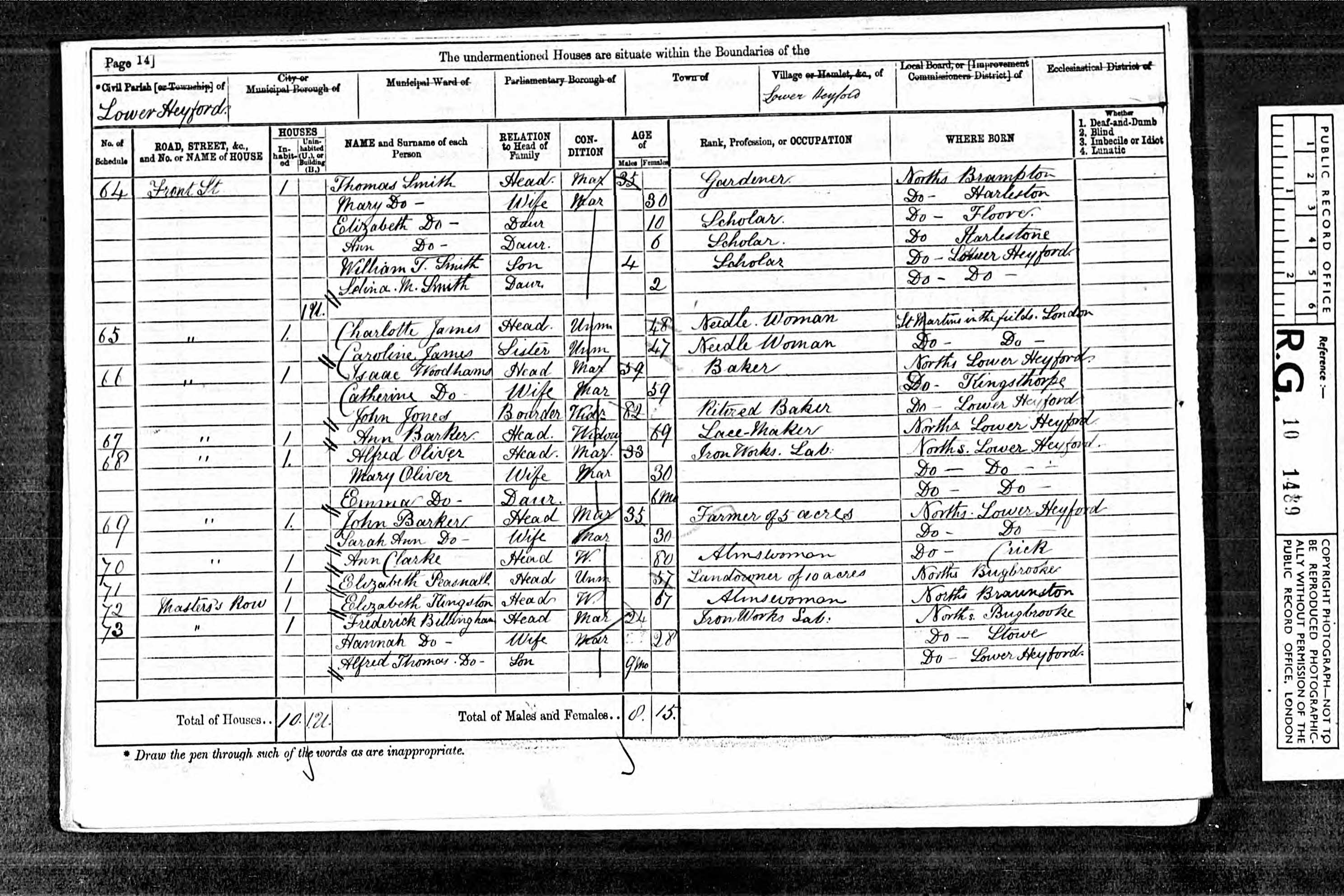 - was recorded in the census on 2 Apr, 1871 at Front Street, Nether Heyford, Northamptonshire, England