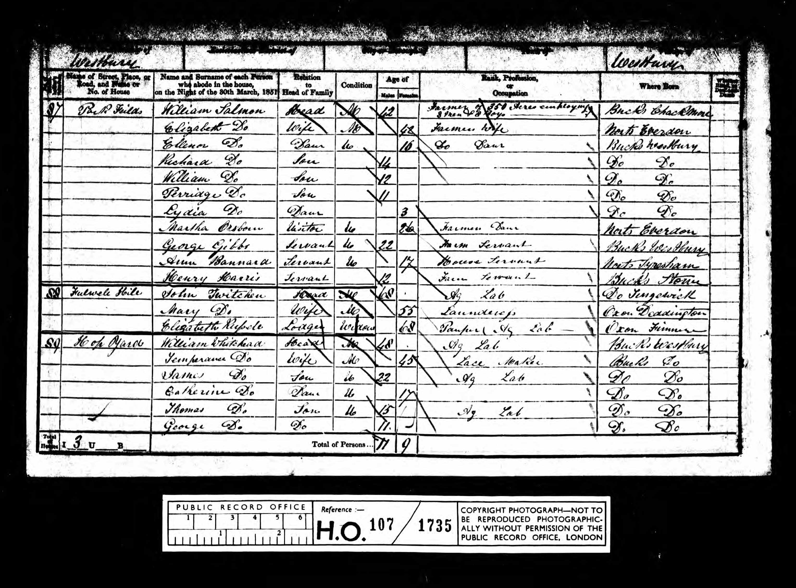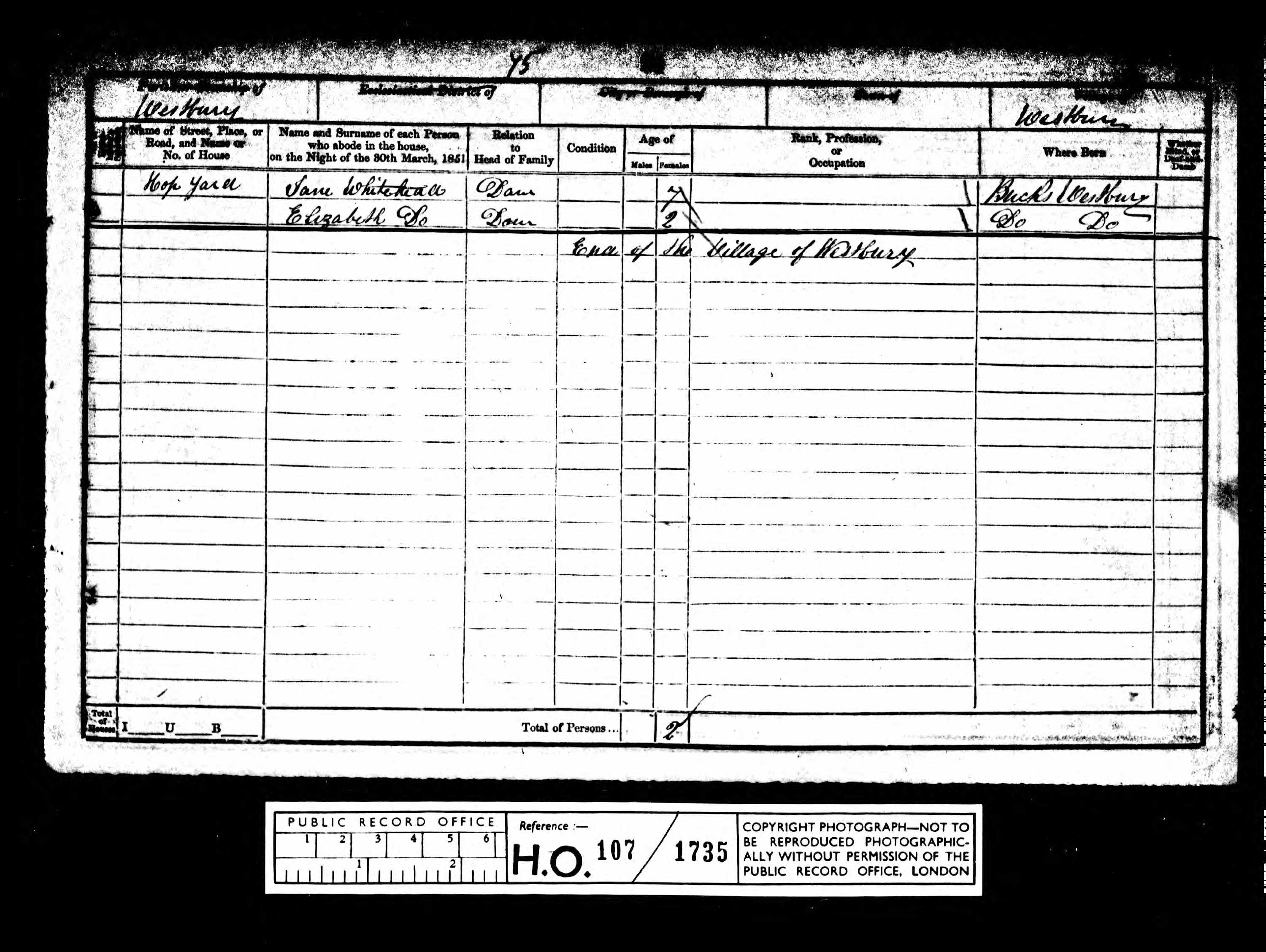 - was recorded in the census on 30 Mar, 1851 at Hoop Yard, Westbury, Buckinghamshire, England
