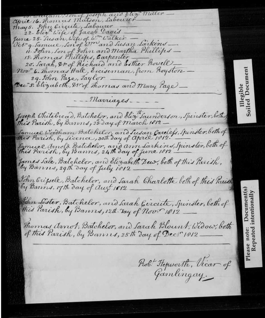 - Joseph Whitebread★ was resident on 25 Mar, 1812 in Gamlingay, Cambridgeshire, England