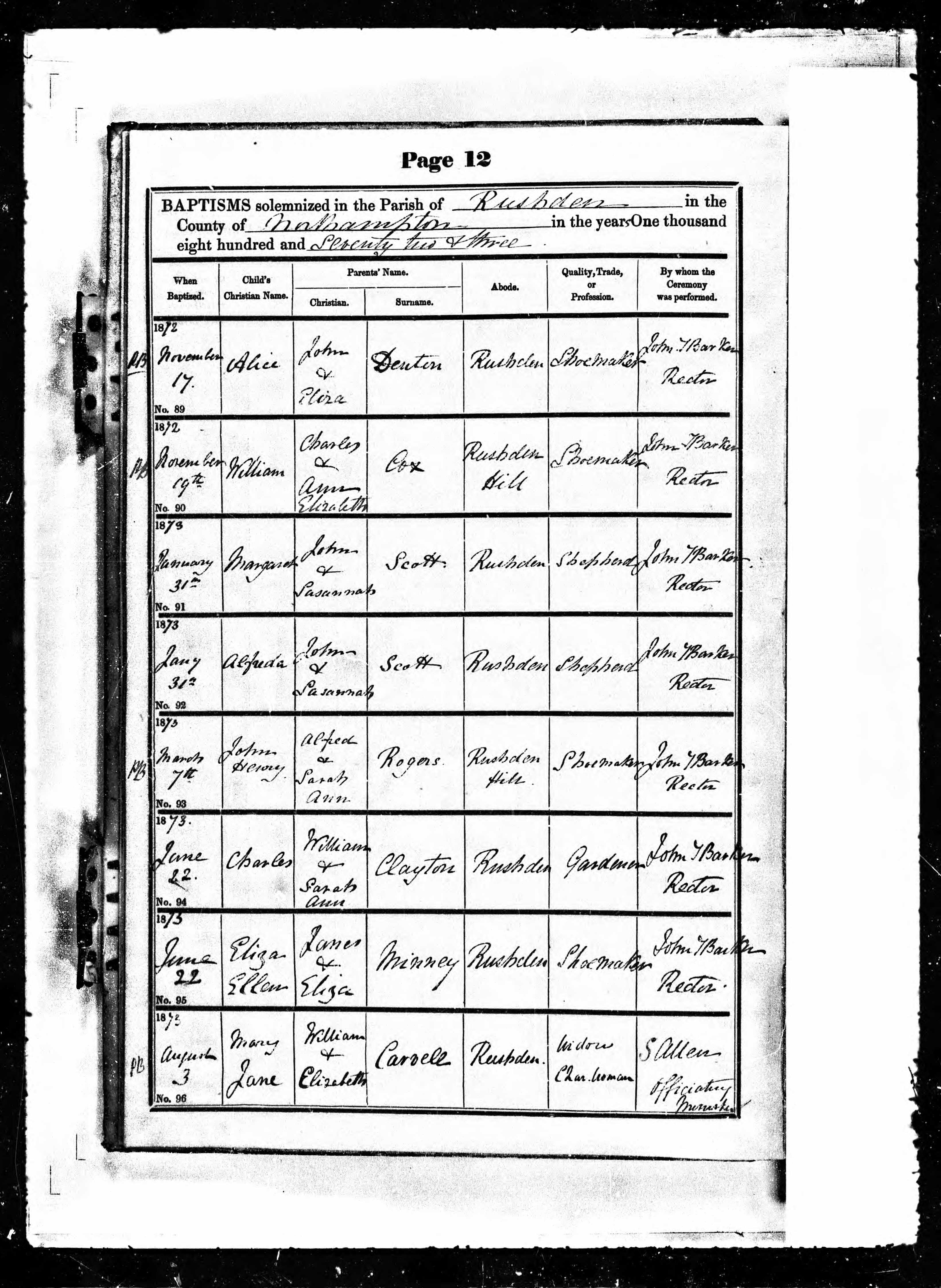 Parish Registers of St Mary's, Rushden, Northamptonshire; Baptism entry for John Henry Rogers, 7 Mar 1873, Page 12, No 93.