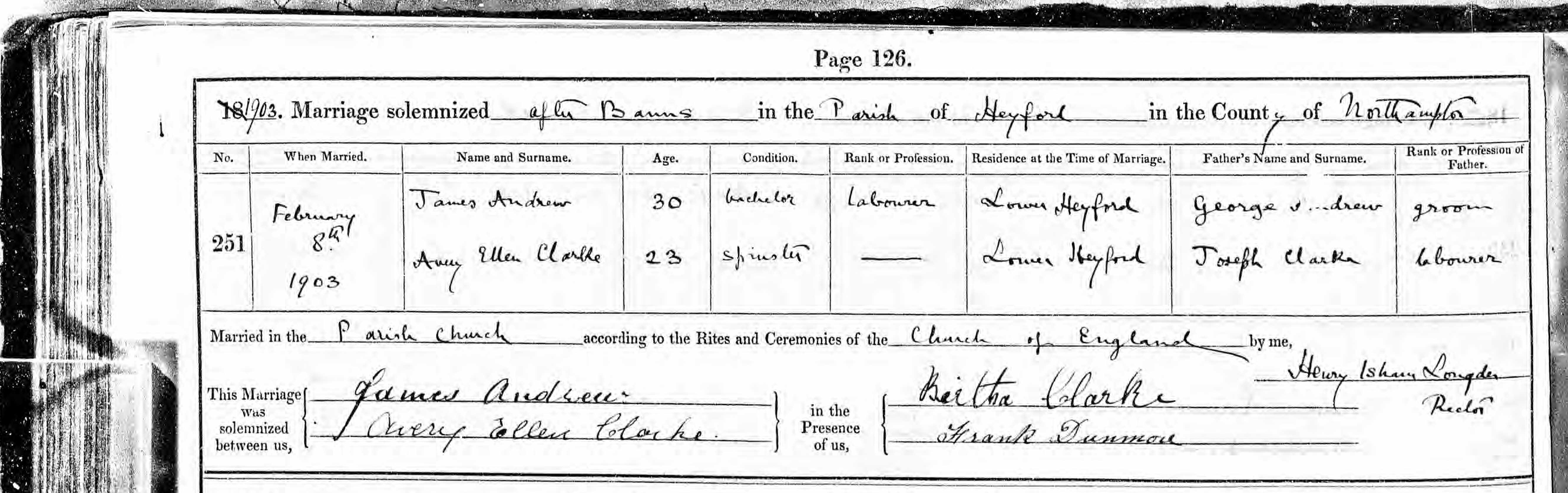 Parish Registers of St Peter & St Paul, Heyford, Northamptonshire; Marriage entry for James Andrew and Avery Ellen Clarke, 8 Feb 1903, Page 126, No 251.
