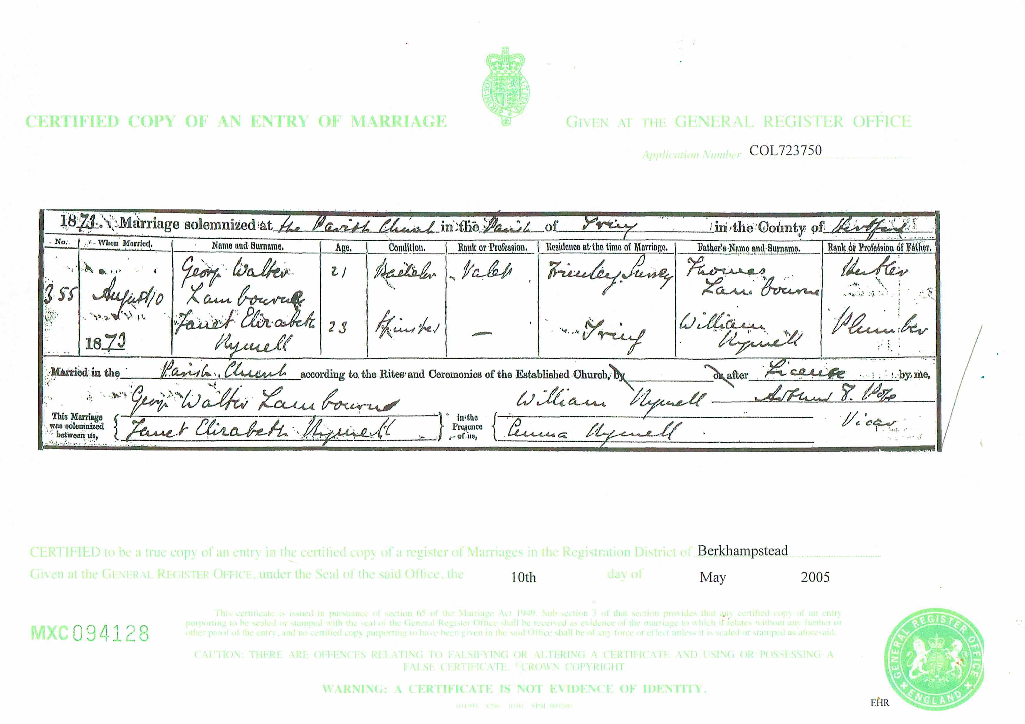 Marriage at The Parish Church in the Registration District of Berkhampstead, district of Parish of Tring, Hertford, 1873, no. 355. Married 10 Aug 1873; George Walter Lambourne, age 21, condition Bachelor, occupation Valet, residence Frimley, Surrey and Janet Elizabeth Rymell, age 23, condition Spinster, residence Tring; groom's father Thomas Lambourne, [Hustler]; bride's father William Rymell, Plumber; married by Licence according to the rites of the Established Church; groom signed name, bride signed name; witnesses William Rymell (signed), Emma Rymell (signed)