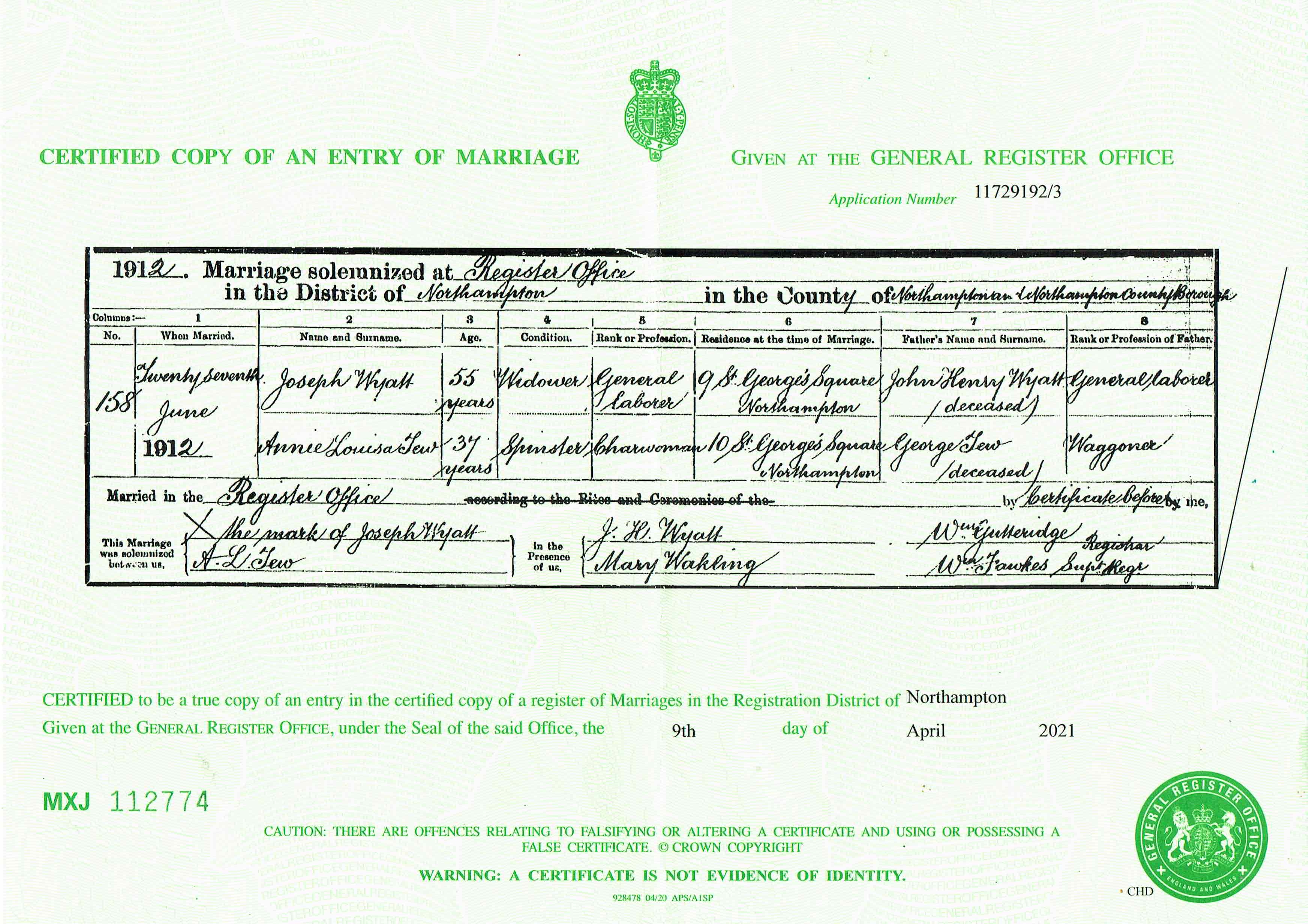 Marriage at The Register Office in the Registration District of Northampton, district of District of Northampton, Northamptonshire, 1912, no. 158. Married 27 Jun 1912; Joseph Wyatt, age 55, condition Widower, occupation General Laborer, residence 9 St George's Square, Northampton and Annie Louisa Tew, age 37, condition Spinster, occupation Charwoman, residence 10 St. George's Square, Northampton; groom's father John Henry Wyatt (deceased), General Laborer; bride's father George Tew (deceased), Waggoner; married by Certificate; groom could not sign name, bride signed name; witnesses J. H. Wyatt (signed), Mary Wakling (signed)