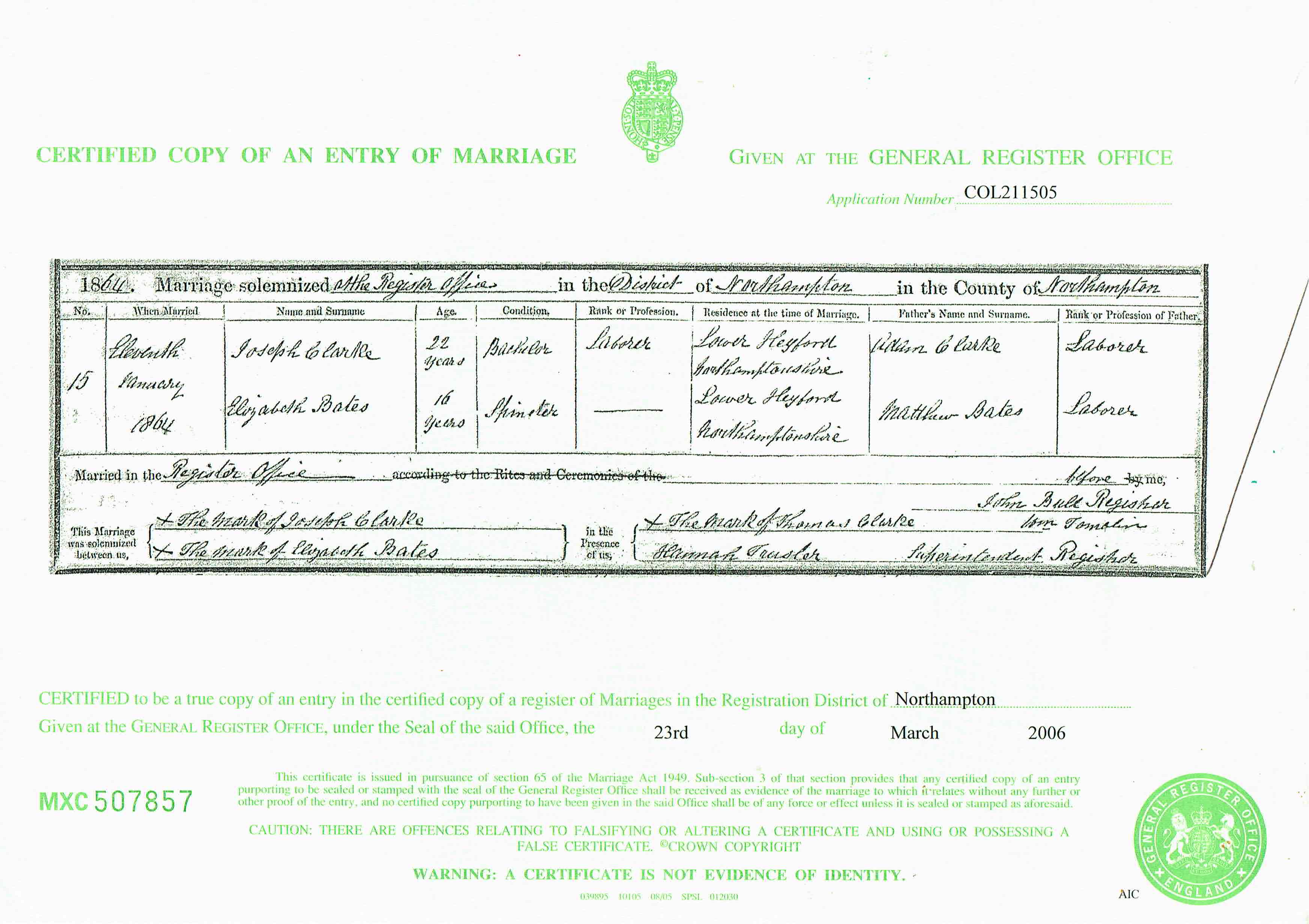 General Register Office of England and Wales; Marriage entry for Joseph Clarke and Elizabeth Bates, Northampton, Jan-Mar Qtr 1864, Vol 3B, Page 125, No 15; Certified copy obtained 23 Mar 2006.