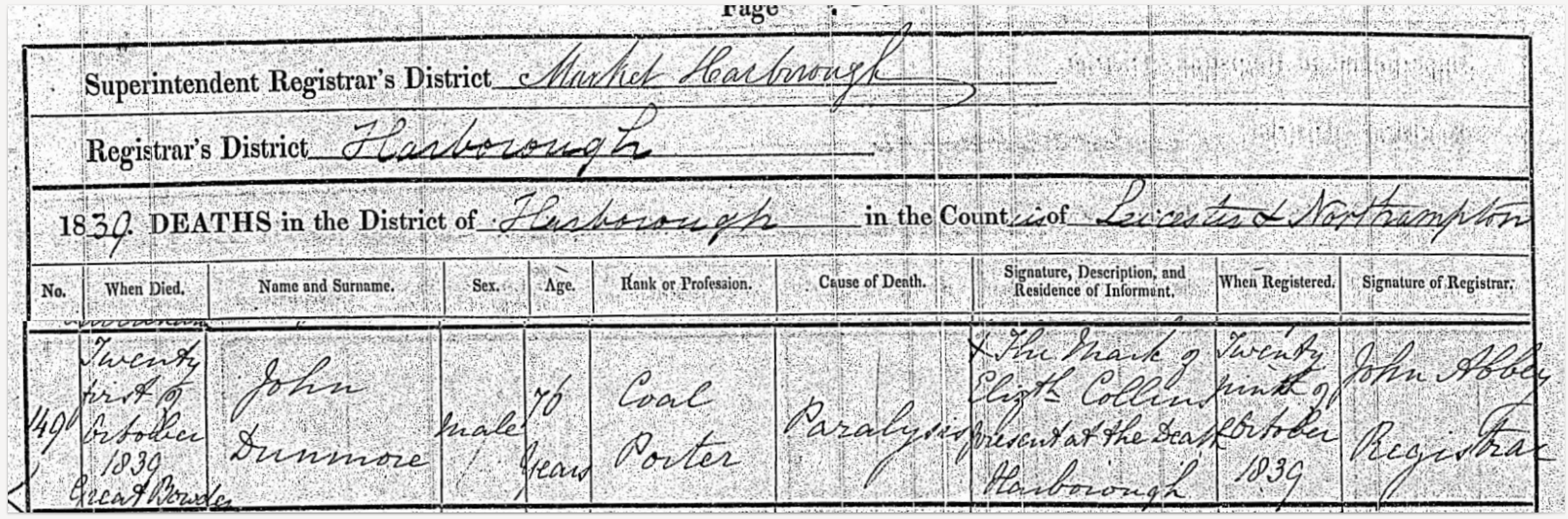 Death in the Registration District of Market Harborough, Sub-district of Harborough, Leicester, 1839, no. 149. Died 21 Oct 1839 at Great Bowden; John Dunmore; Male; age 76; Coal porter. Cause of death: Paralysis. Informant was Elizabeth Collins (could not sign name); relation: Not known; residing at Harborough; present at death. The death was registered 29 Oct 1839.