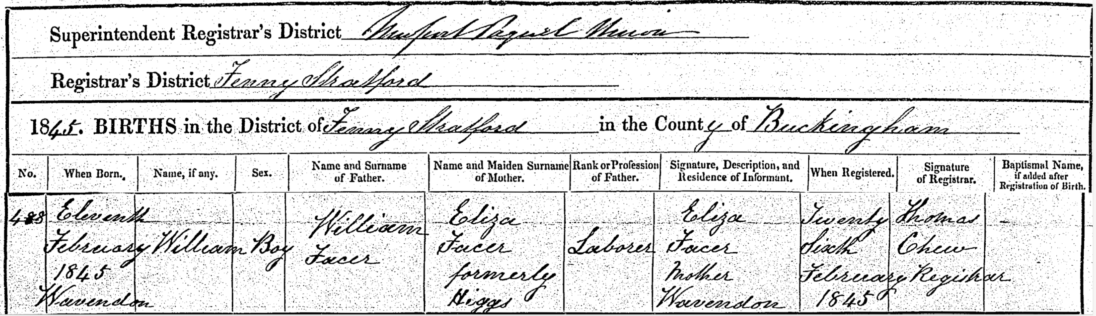 Birth in the Registration District of Newport Pagnell Union, Sub-district of Fenny Stratford, Buckingham, 1845, no. 488. Born 11 Feb 1845 at Wavendon; William Facer; Boy; father William Facer; mother Eliza Facer, formerly Higgs. Occupation of father: Labourer. Informant was Eliza Facer; Mother; Wavendon; signed name. The birth was registered 26 Feb 1845.
