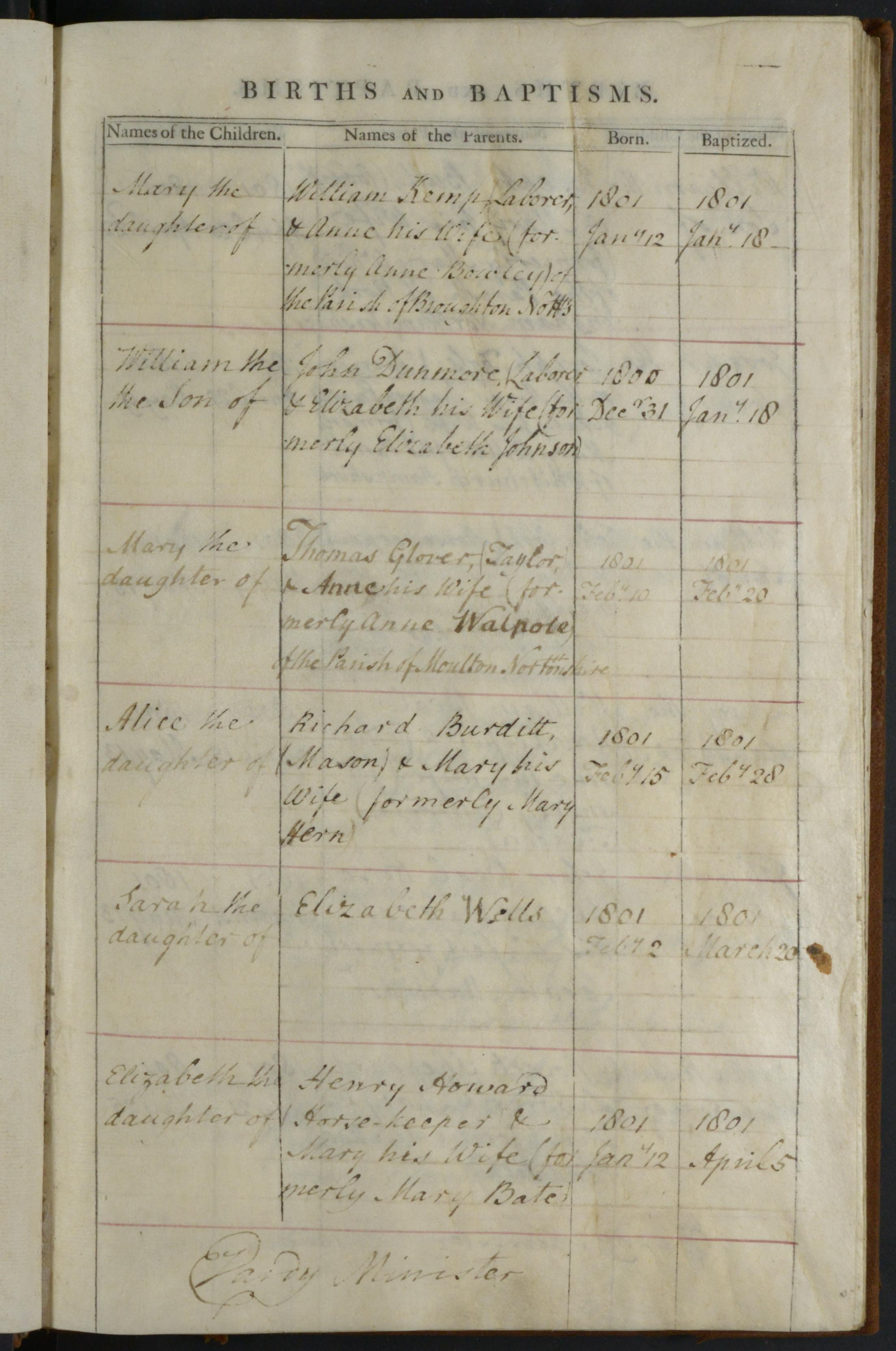 Parish Registers of St Dionysius, Market Harborough, Leicestershire; Baptism entry for William Dunmore, 18 Jan 1801.