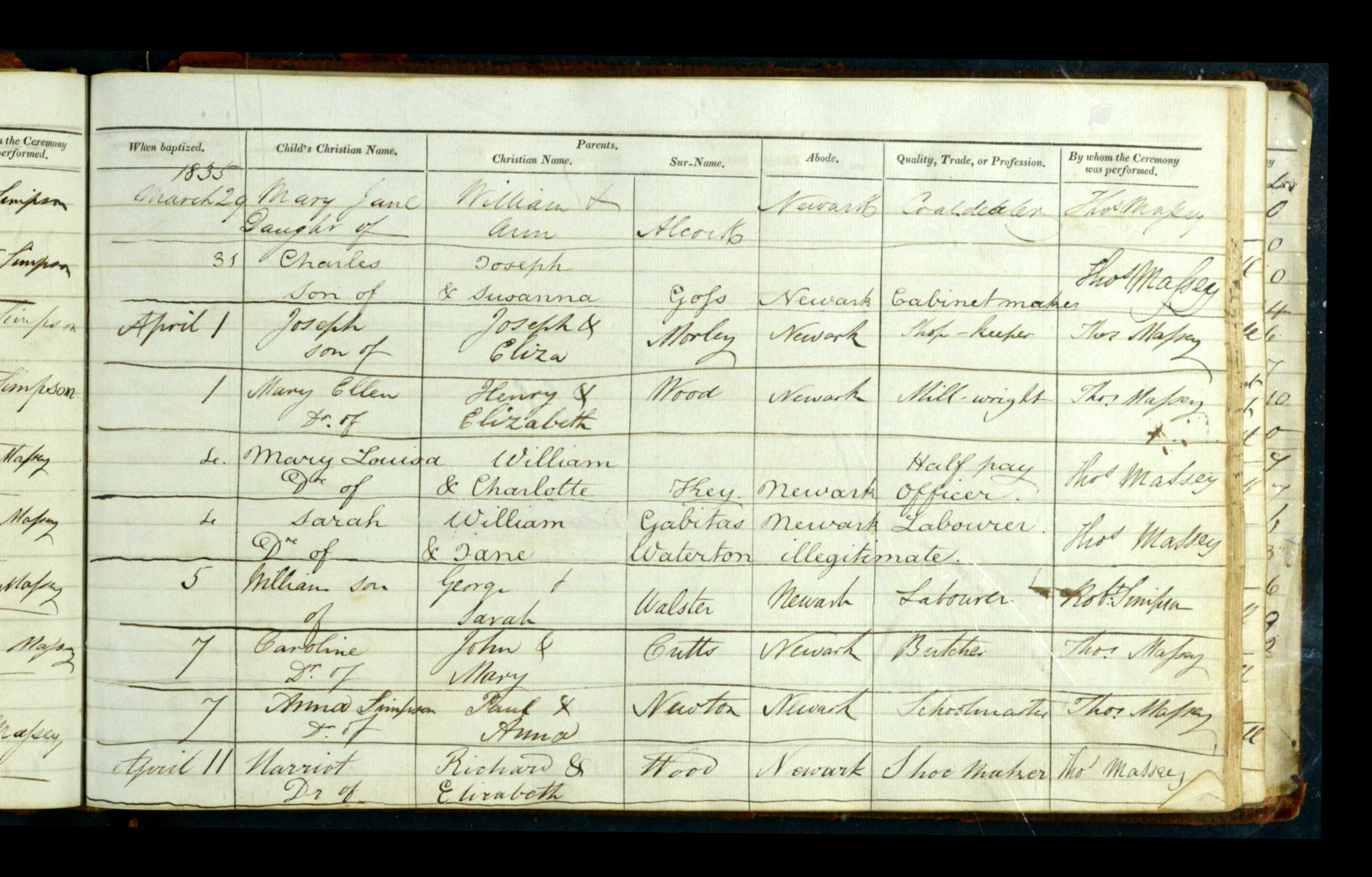 Parish Registers of St. Mary Magdalene, Newark, Nottinghamshire; Baptism entry for Mary Jane Alcock, 29 Mar 1835.