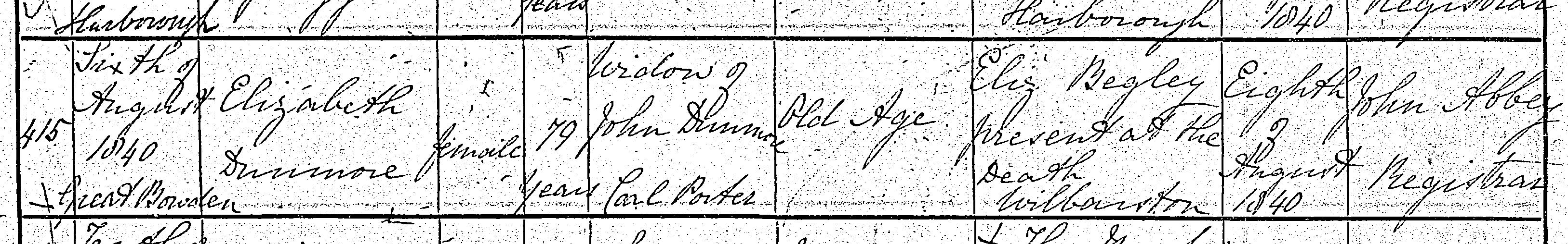 Death in the Registration District of Market Harborough, Leicestershire, 1840, no. 415. Died 6 Aug 1840 at Great Bowden; Elizabeth Dunmore; Female; age 79; Widow of John Dunmore, Coal Porter. Cause of death: Old Age. Informant was Eliz Begley (signed name); relation: Not known; residing at Wilbarston; present at death. The death was registered 8 Aug 1840.