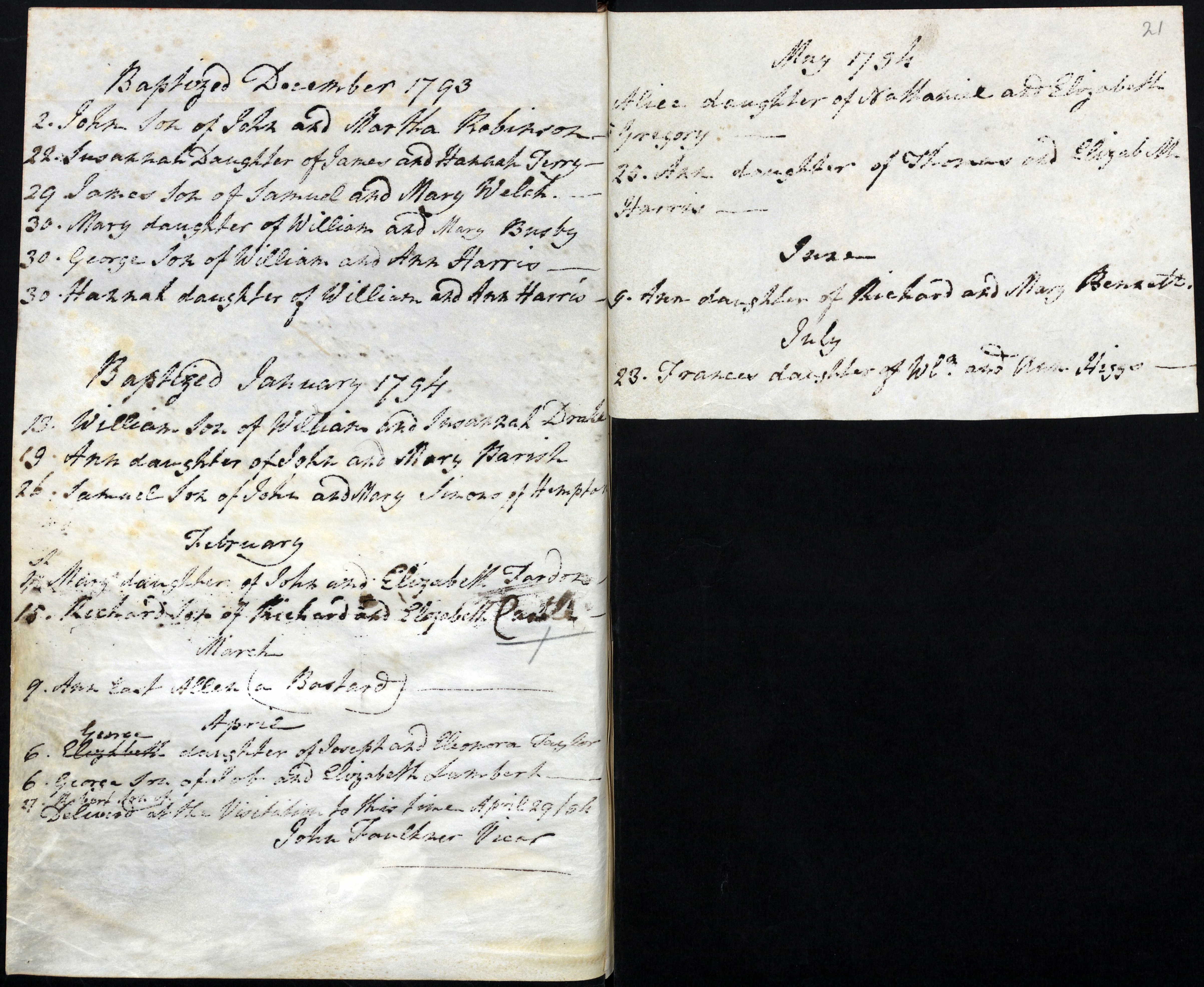 Parish Registers of St. Peter & St. Paul, Deddington, Oxfordshire; Baptism entry for Frances Higgs, 23 Jul 1794.