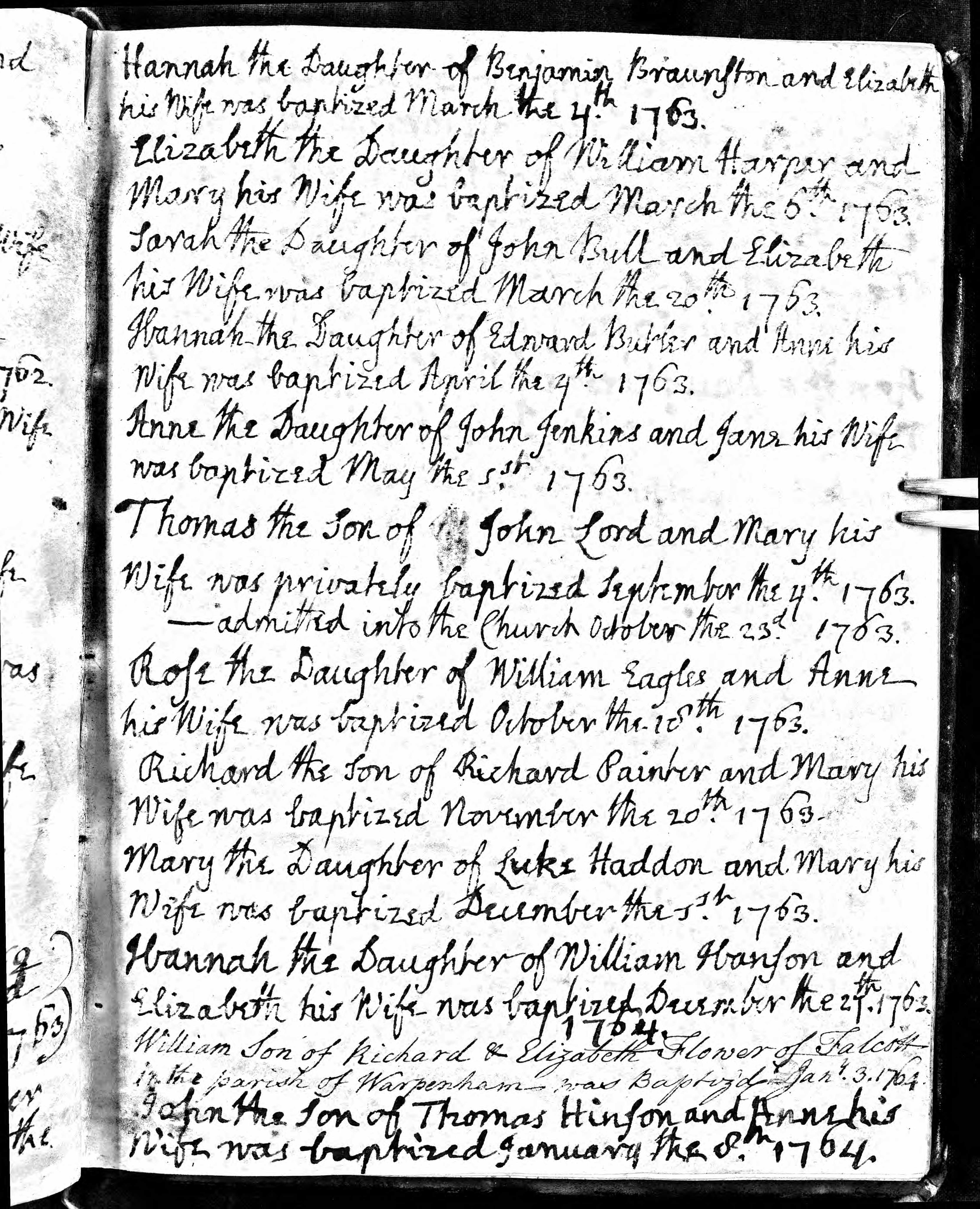 Parish Registers of St. Mary Magdalene, Helmdon, Northamptonshire; Baptism entry for John Hinson, 8 Jan 1764.