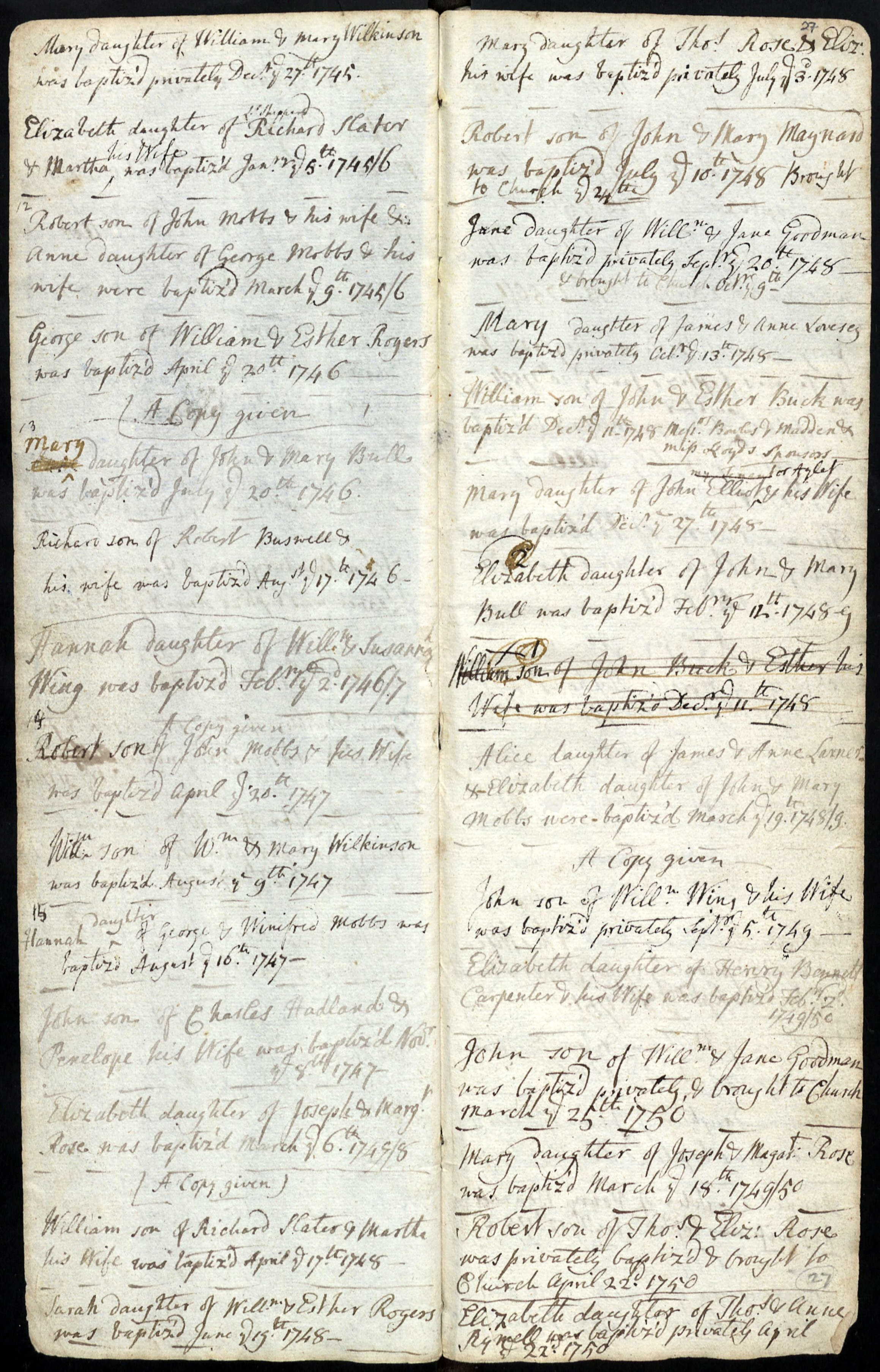 Parish Registers of St Mary the Virgin, North Aston, Oxfordshire; Baptism entry for Elizabeth Rose, 6 Mar 1747/8.