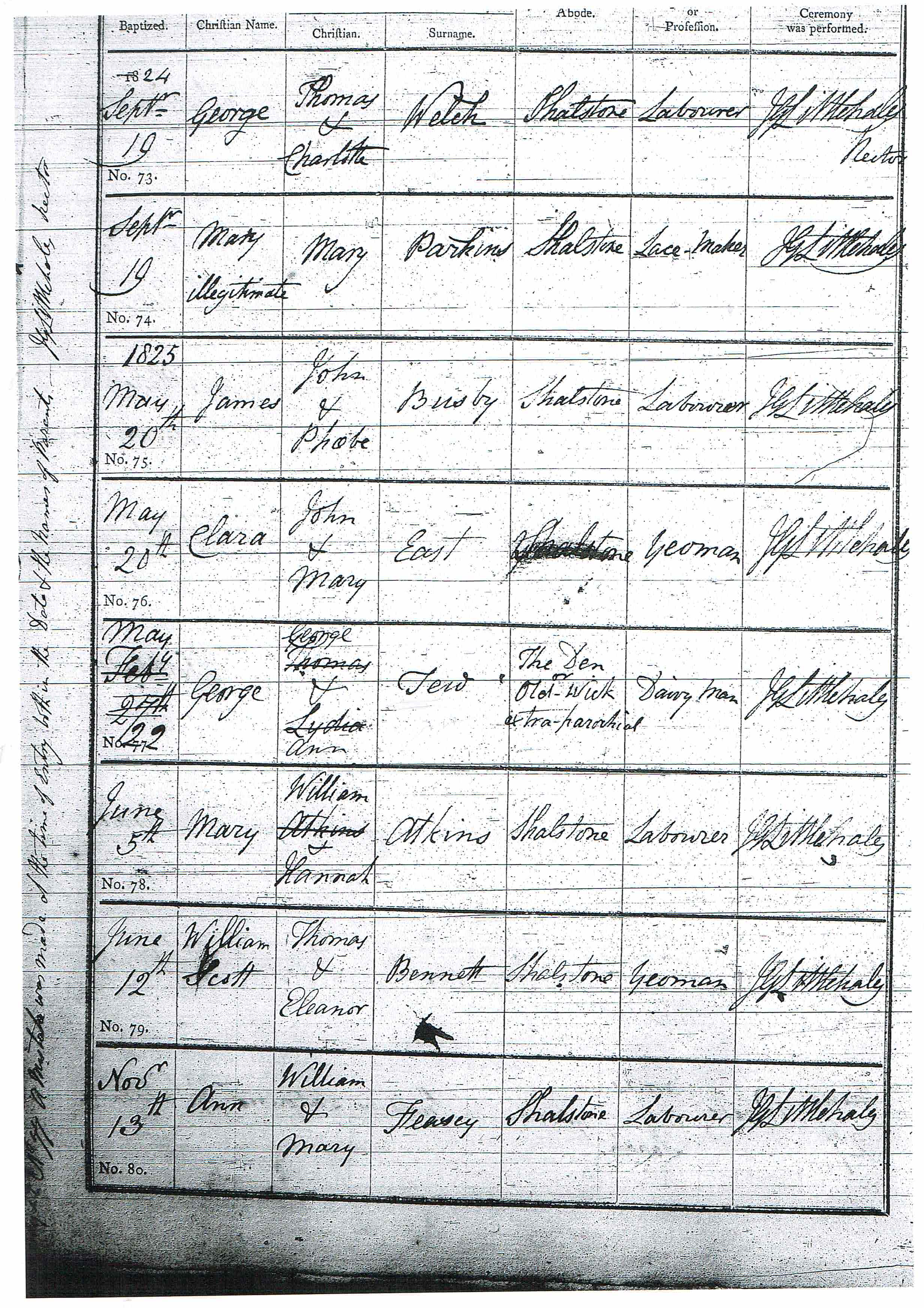 George, son of Thomas and Lydia Tew, abode The Den or Old-Wick extra parochial, occ. Dairy Man. The date and parents names have been struck out and replaced with May 22, George and Ann. The rector has written in the margin: "May 22, No 77. A mistake was made of the time of Entry within the date & the names of parents"