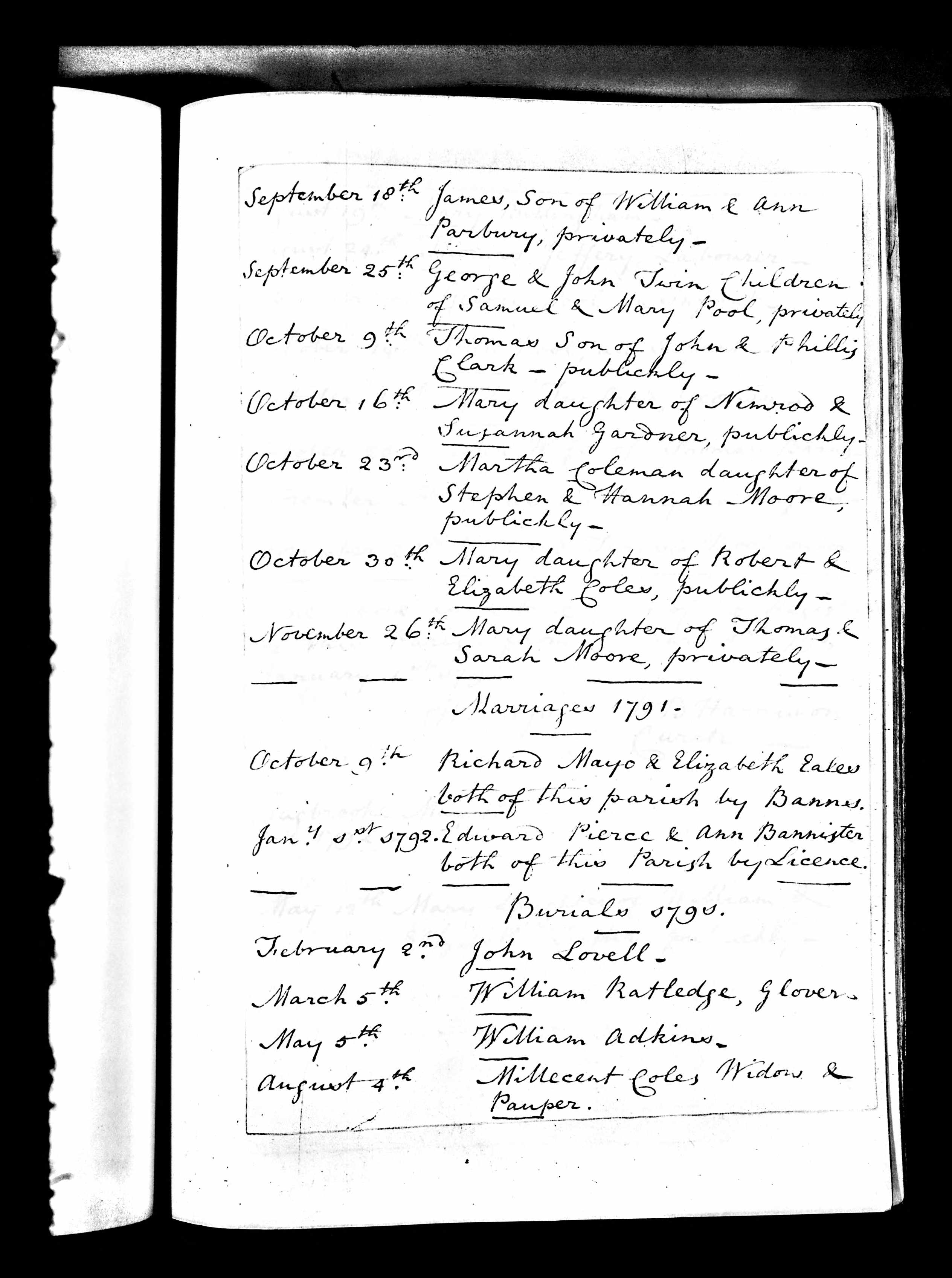 Bishop's Transcripts for the Diocese of Peterborough, England; Baptism entry for Thomas Clark, Bugbrooke, 9 Oct 1791.