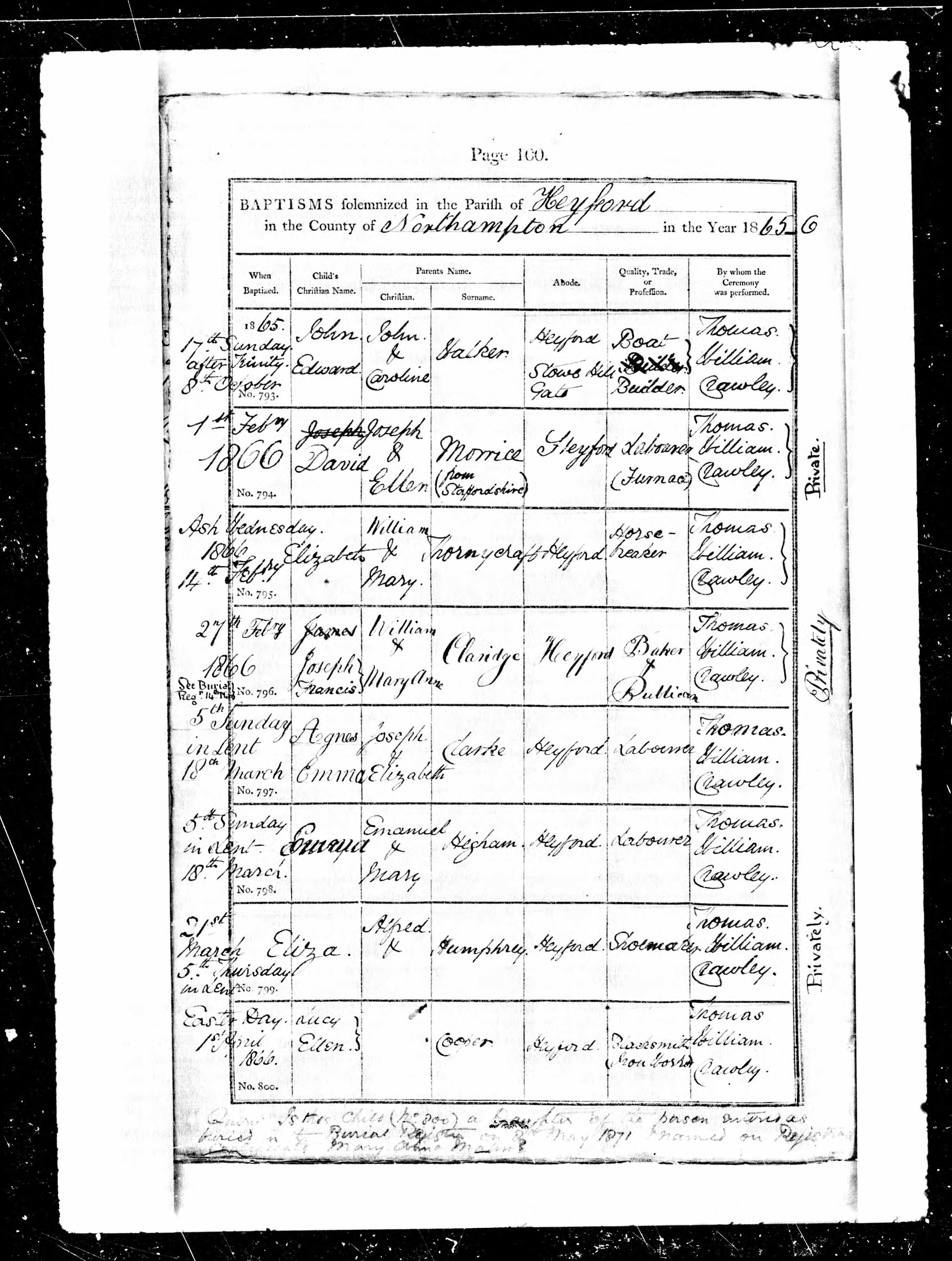 - Joseph Clarke★ was resident on 18 Mar, 1866 in Nether Heyford, Northamptonshire, England