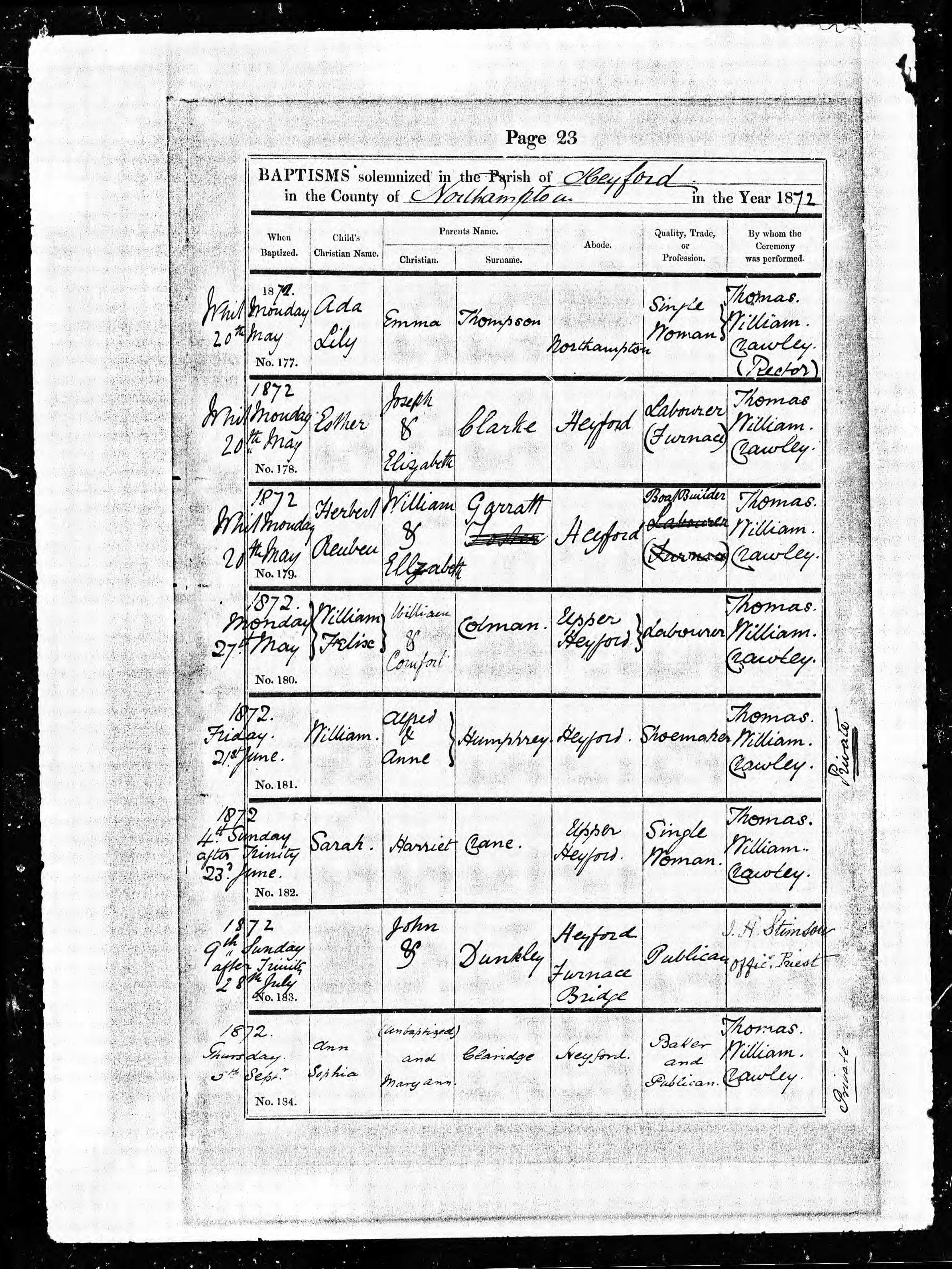 - Esther Clarke was baptised on 20 May, 1872 in Heyford, Northamptonshire, England