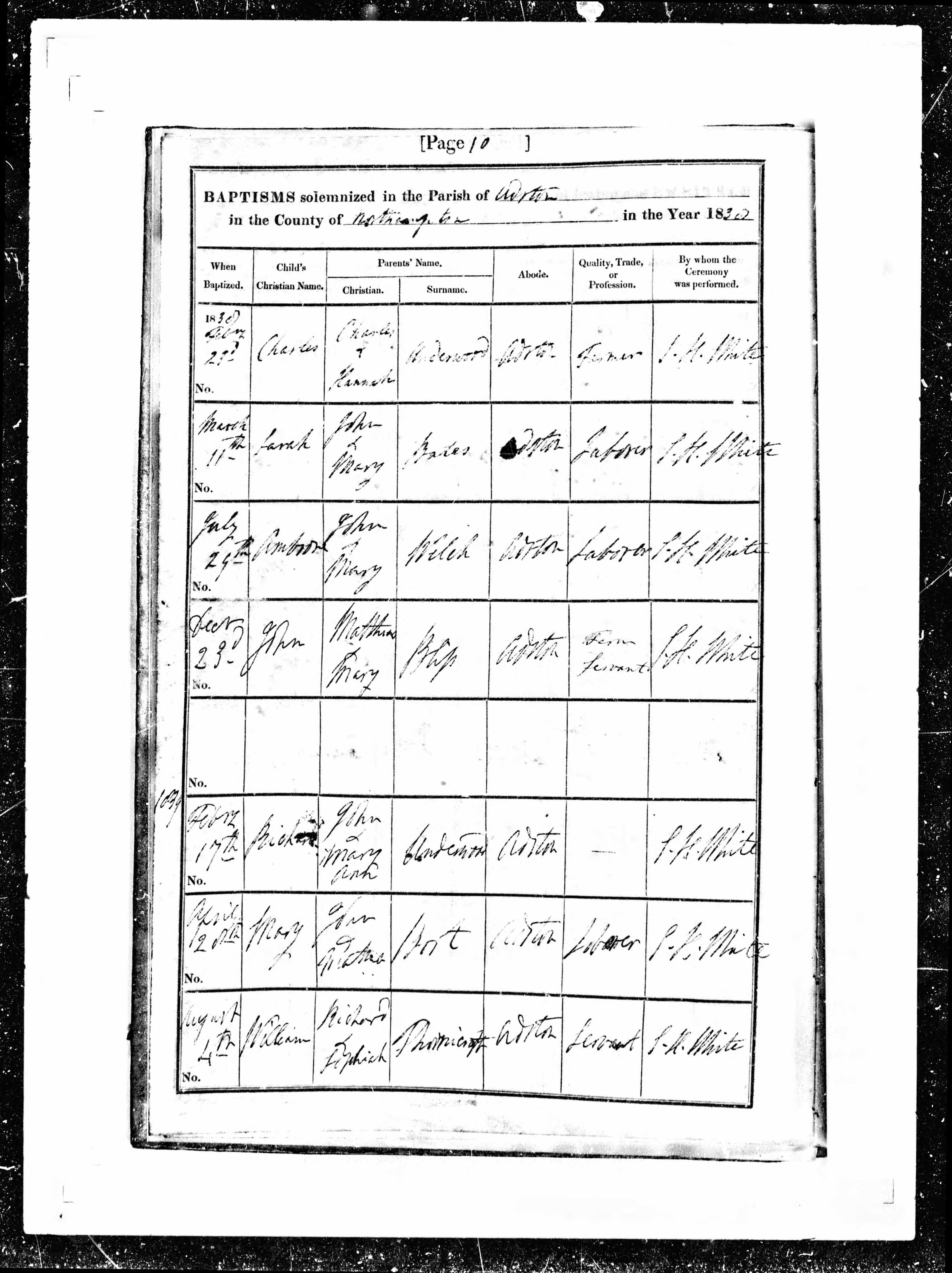 Parish Registers of All Saints, Adstone, Northamptonshire; Baptism entry for Sarah Bates, 11 Mar 1838, Page 10.