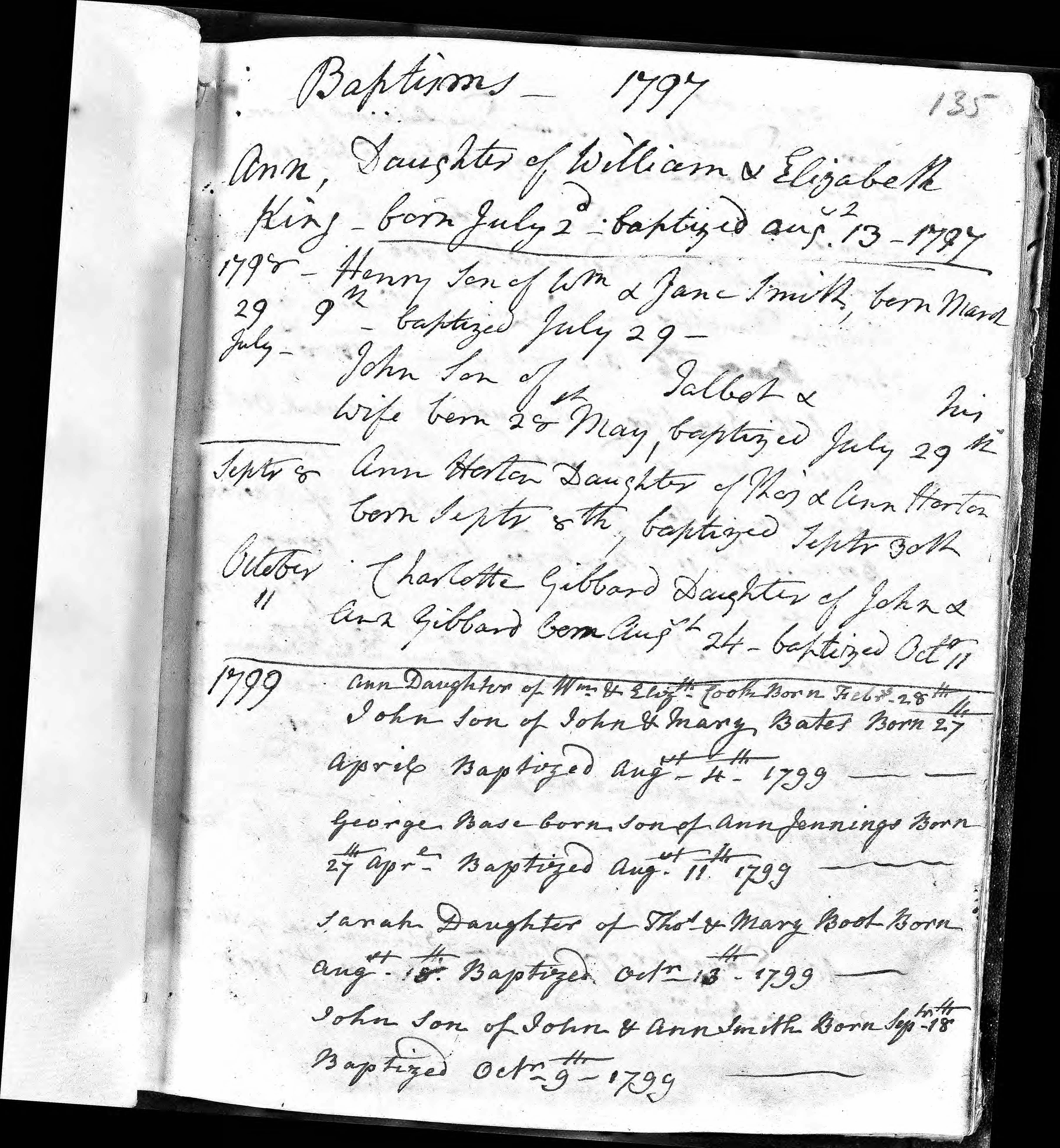 Parish Registers of St. Mary, Canons Ashby, Northamptonshire; Baptism entry of John Bates, 4 Aug 1799.