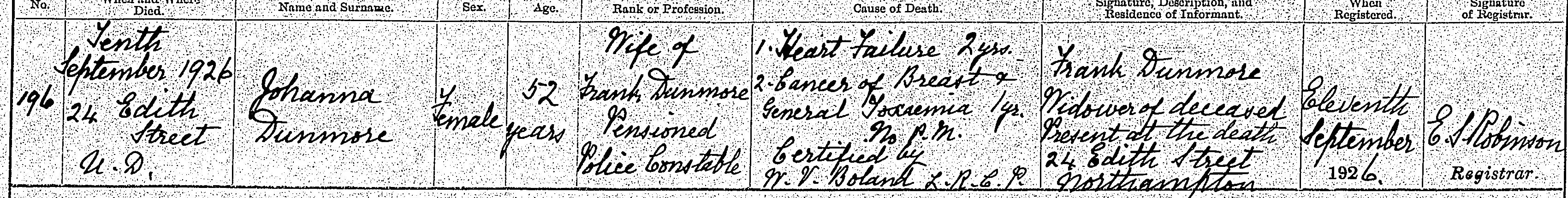 Death in the Registration District of Northampton and Hardingstone, Northamptonshire, 1926, no. 196. Died 10 Sep 1926 at 24 Edith Street; Johanna Dunmore; Female; age 52; Wife of Frank Dunmore. Pensioned Police Constable. Cause of death: 1. Heart Failure 2yrs; 2. Cancer of Breast and General Toxaemia 1yr; no pm; certiified. Informant was Frank Dunmore (signed name); relation: Husband; residing at 24 Edith Street, Northampton; present at death. The death was registered 11 Sep 1926.