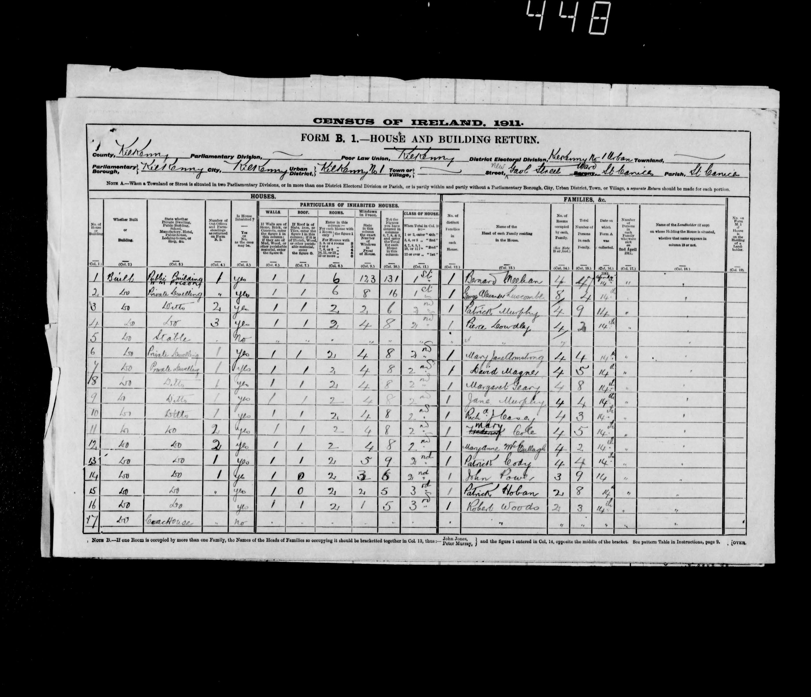 1911 Ireland Census; House and Building Return, Gaol Street, Kilkenny Urban No 1, Kilkenny.