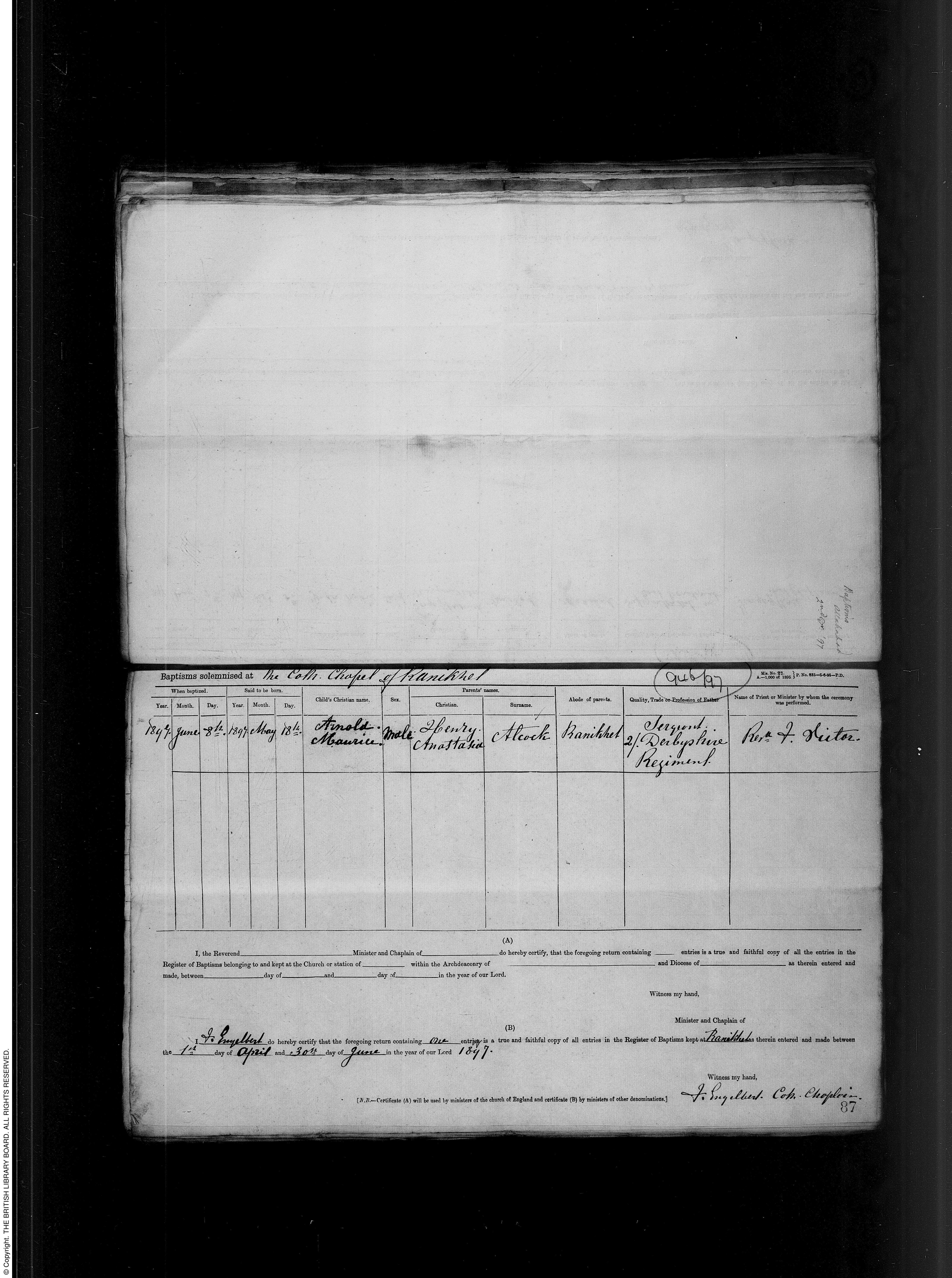 Arnold Maurice son of Henry and Anastasia Alcock, abode Ranikhet, occ. Sergeant 2/. Derbyshire Regiment, born 18 May 1897