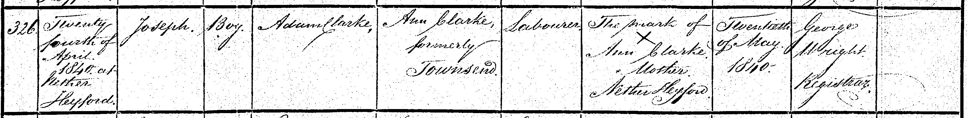 Birth in the Registration District of Northampton Union, Northampton, 1840, no. 326. Born 24 Apr 1840 at Nether Heyford; Joseph Clarke; Boy; father Adam Clarke; mother Ann Clarke formerly Townsend. Occupation of father: Labourer. Informant was Ann Clark; Mother; Nether Heyford; could not sign name. The birth was registered 20 May 1840.