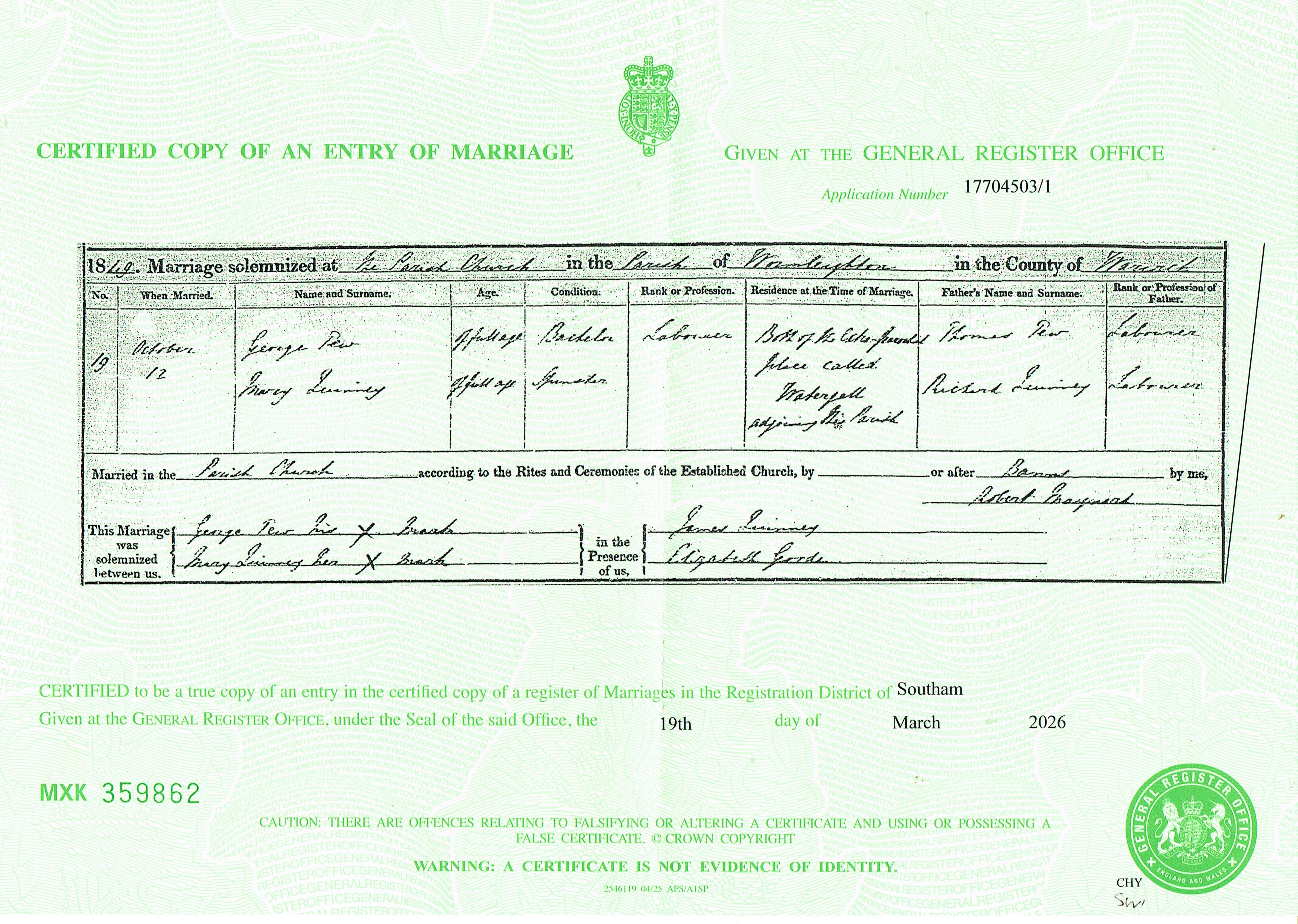 General Register Office of England and Wales; Marriage entry for George Tew and Mary Quinney, Southam, Oct-Dec Qtr 1849, Vol 16, Page 793, No 19; Certified copy obtained 31 Mar 2026.