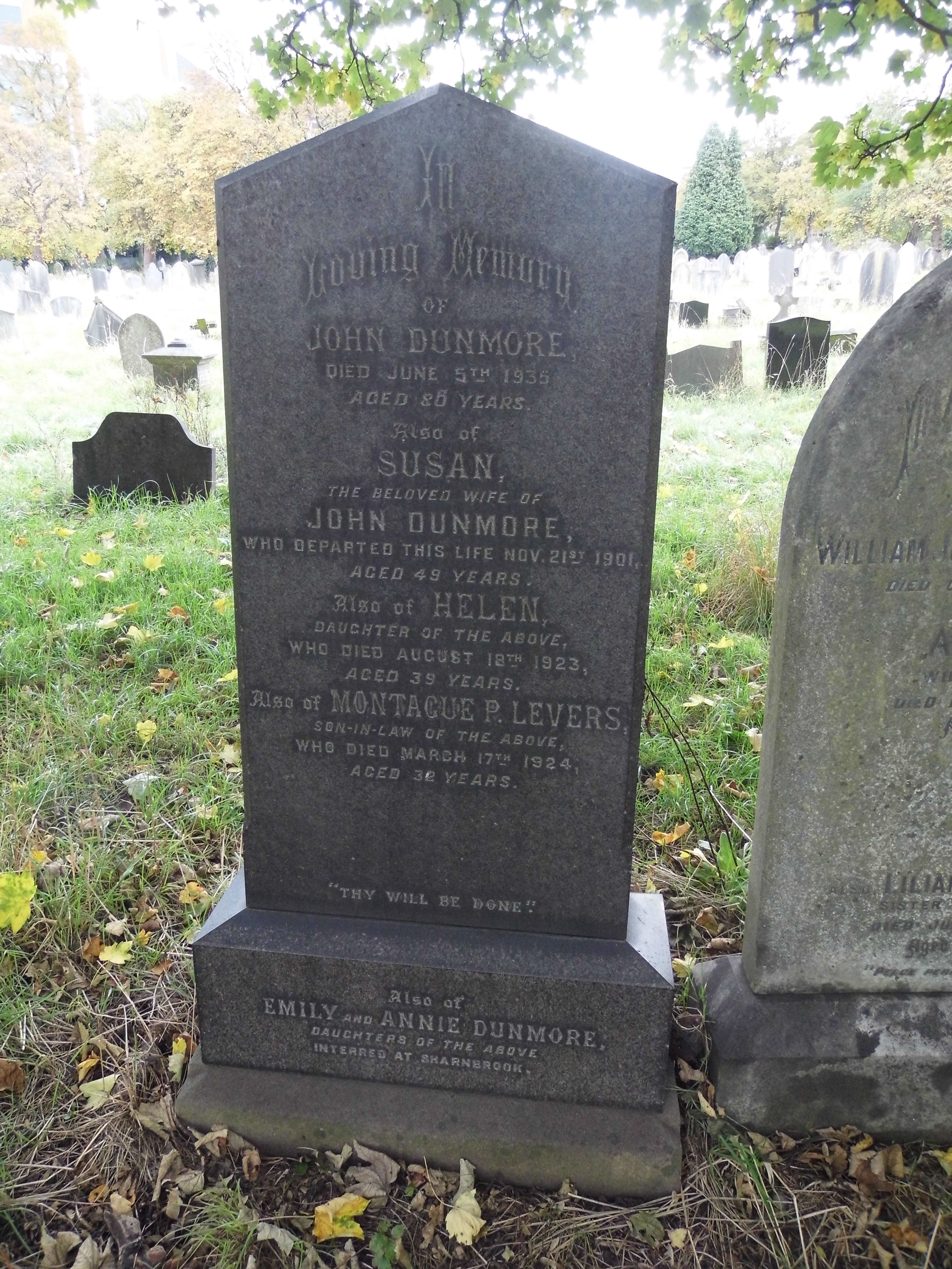 In Loving Memory of JOHN DUNMORE, DIED JUNE 5TH 1936 AGED 86 YEARS.Also of SUSAN, THE BELOVED WIFE OF JOHN DUNMORE, WHO DEPARTED THIS LIFE NOV. 21ST 1901, AGED 49 YEARS.