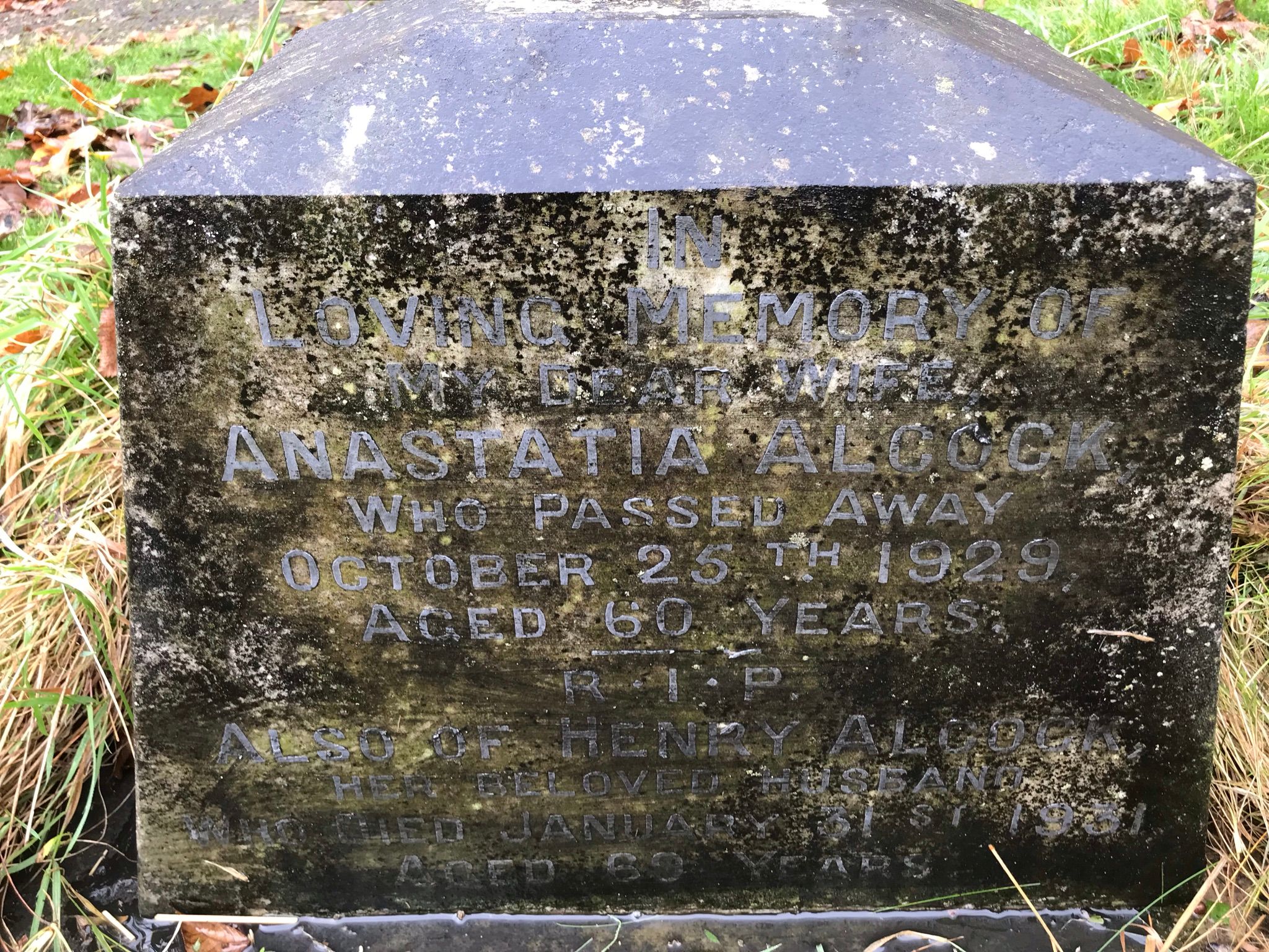 IN LOVING MEMORY OF MY DEAR WIFE ANASTATIA ALCOCK WHO PASSED AWAY OCTOBER 25TH 1929 AGED 60 YEARS R.I.P.ALSO OF HENRY ALCOCK HER BELOVED HUSBAND WHO DIED JANUARY 31ST 1931 AGED 69 YEARS