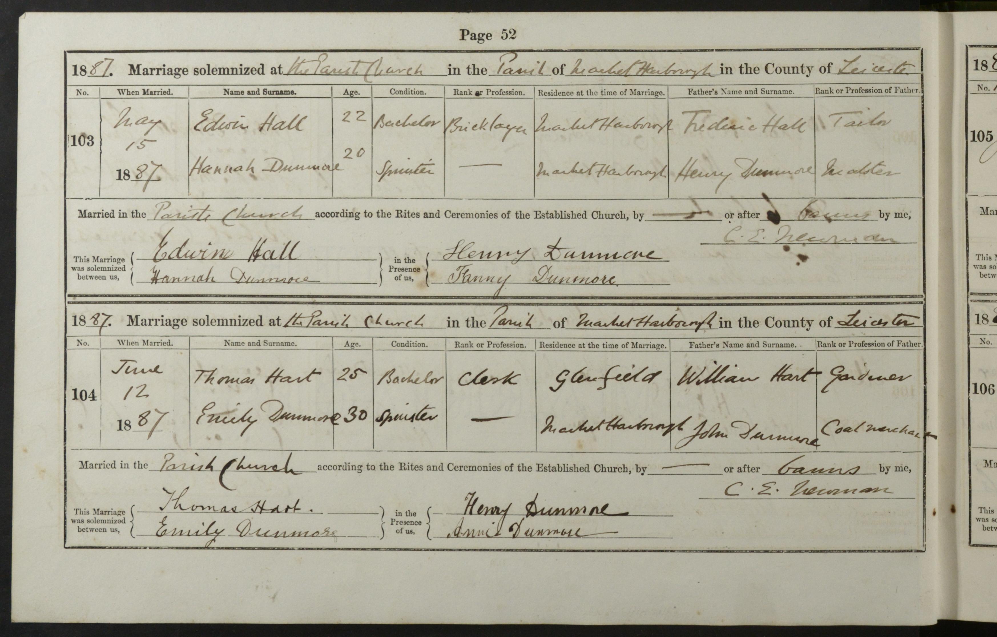 Parish Registers of St Dionysius, Market Harborough, Leicestershire; Marriage entry for Thomas Hart and Emily Dunmore, 12 Jun 1887, Page 52, No 104.