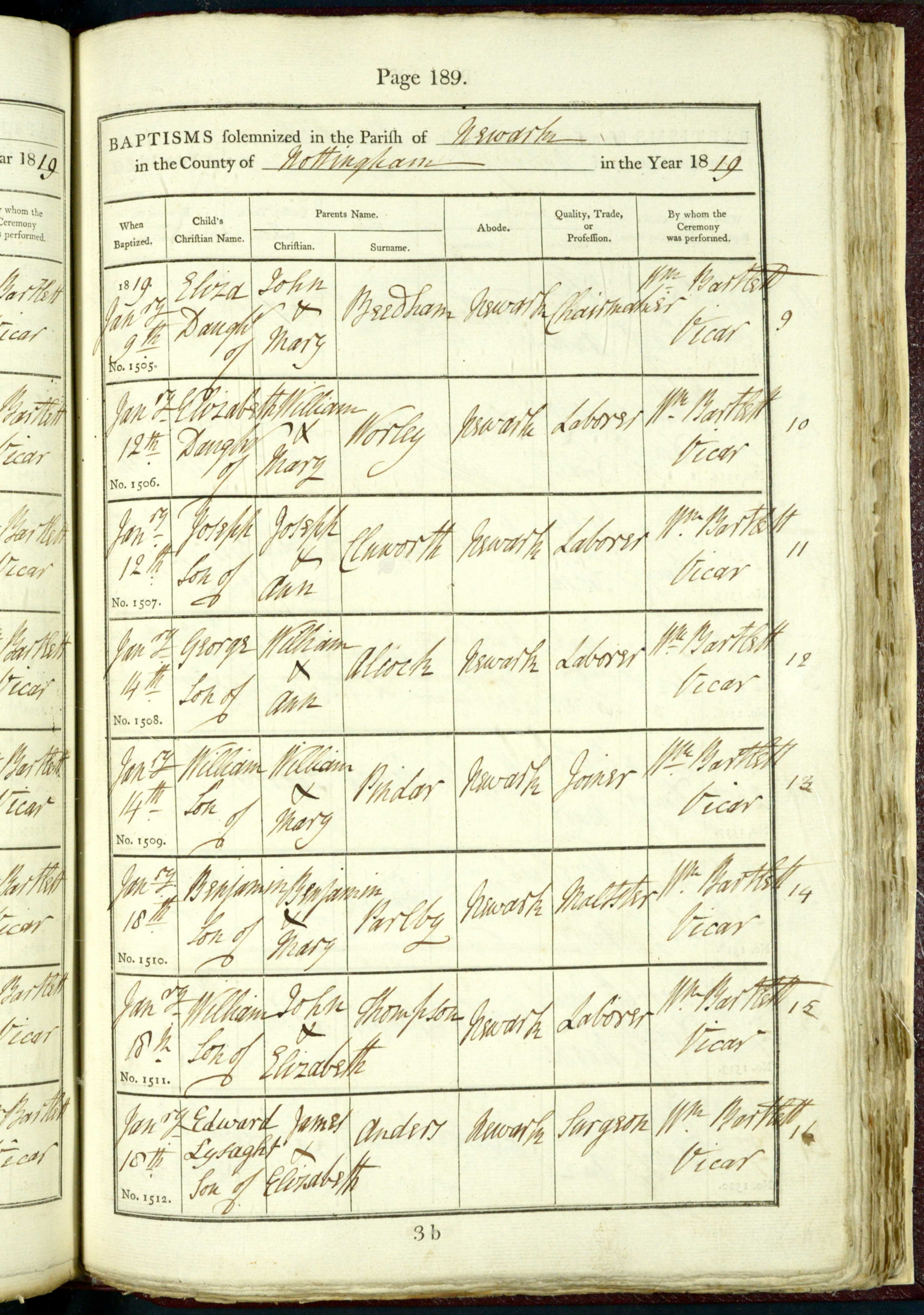 Parish Registers of St. Mary Magdalene, Newark, Nottinghamshire; Baptism entry for George Alcock, 14 Jan 1819, Page 189, No 1508.