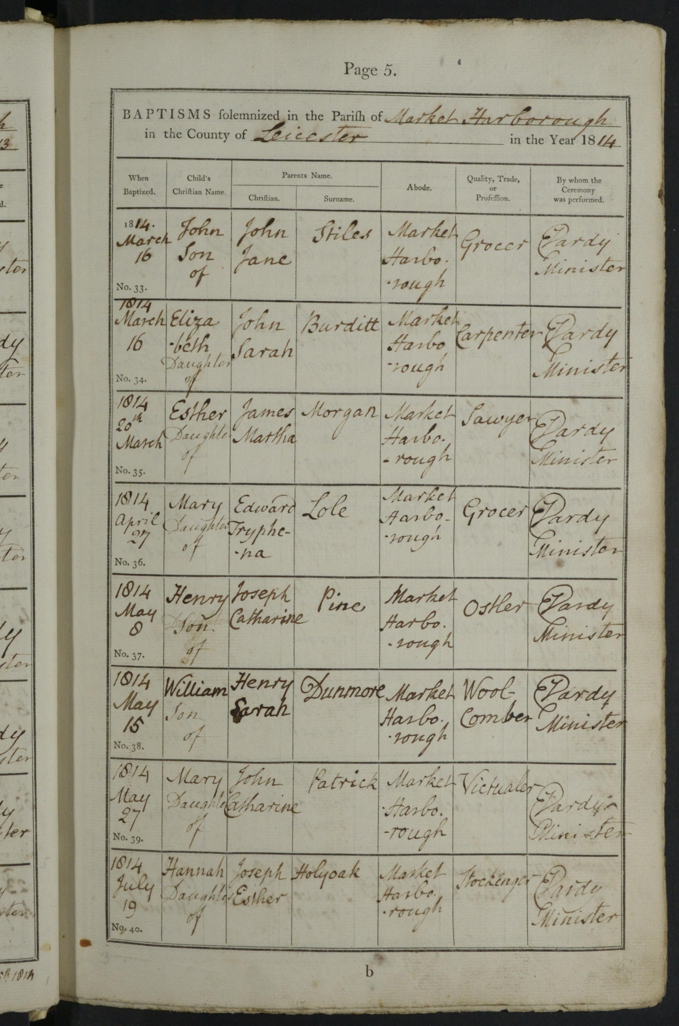 Parish Registers of St Dionysius, Market Harborough, Leicestershire; Baptism entry for William Dunmore, 15 May 1814, Page 5, No 38.