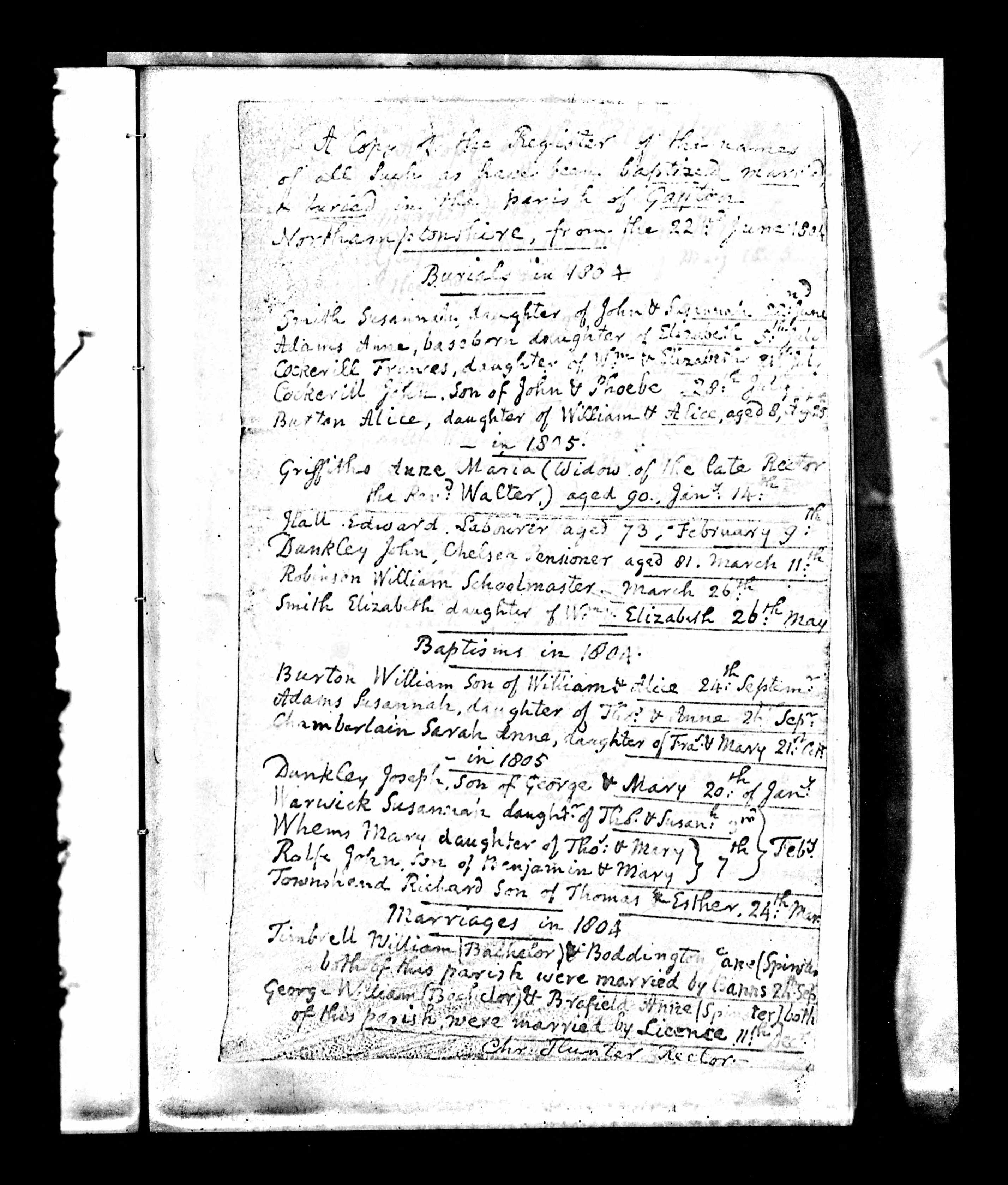 Bishop's Transcripts for the Diocese of Peterborough, England; Baptism entry for Richard Townshend, Gayton, 24 Mar 1805.