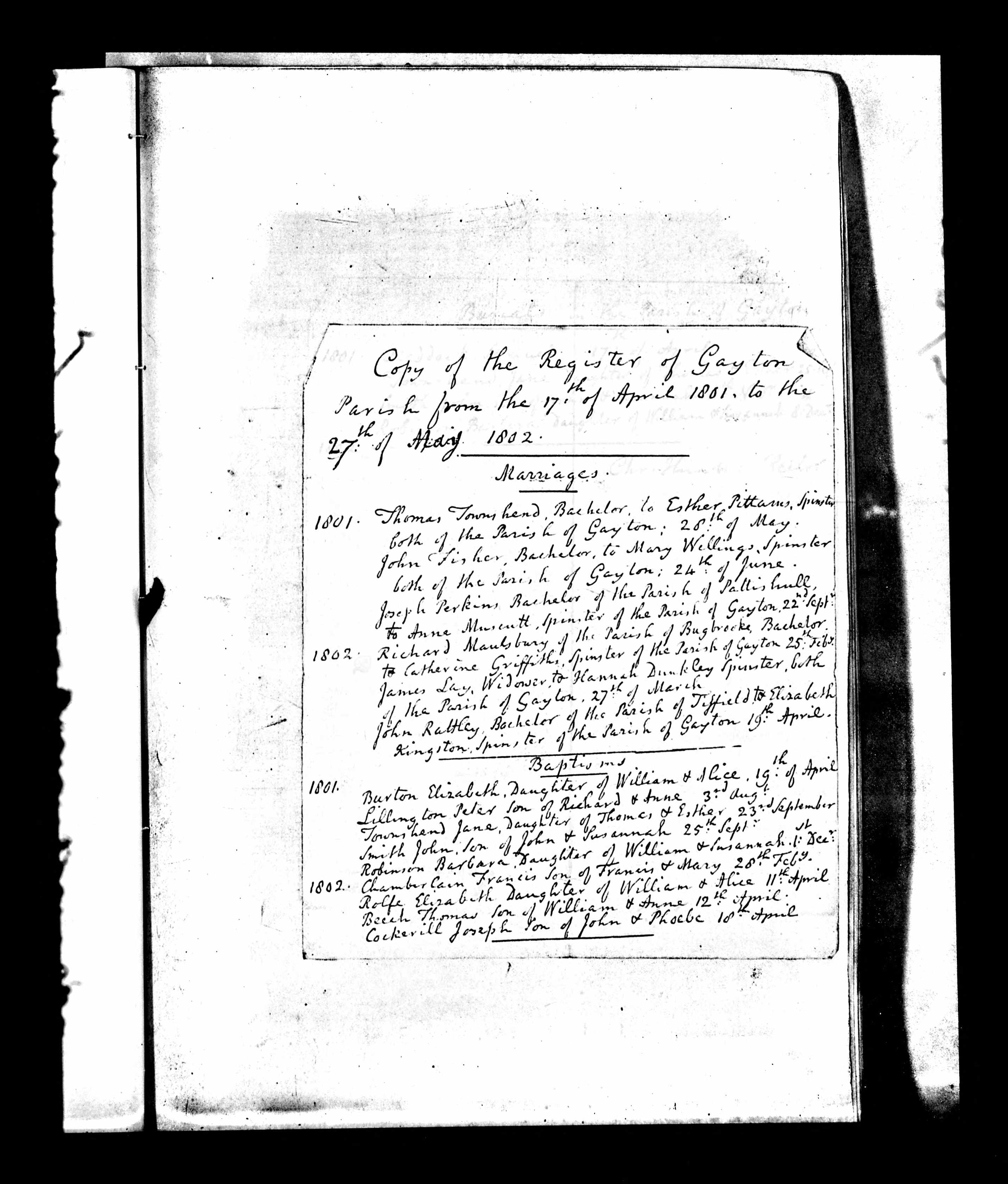- Jane Townsend was baptised on 23 Sep, 1801 at St. Nicholas Church, Gayton, Northamptonshire, England
