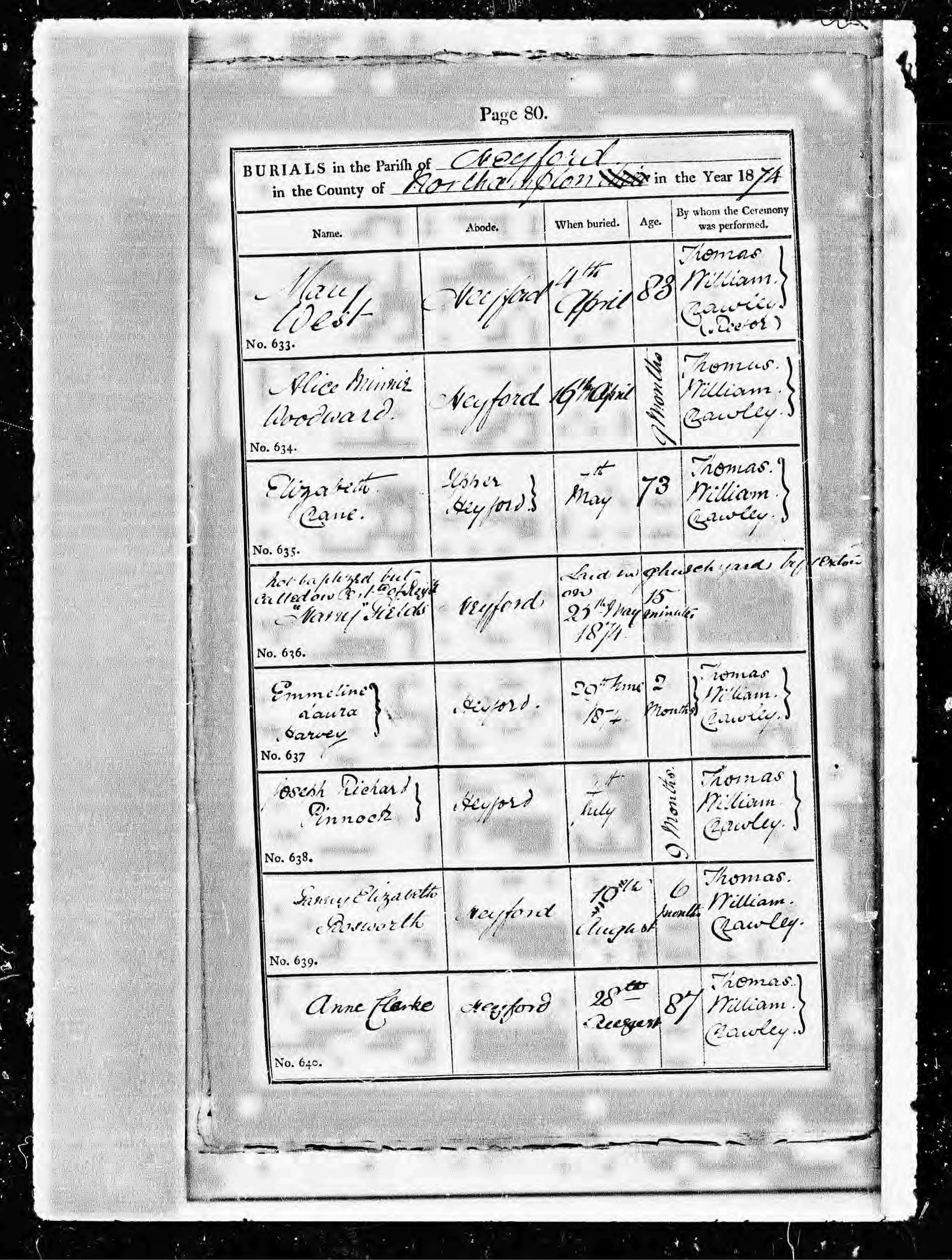 Parish Registers of St Peter & St Paul, Heyford, Northamptonshire; Burial entry for Anne Clarke, 28 Aug 1874, Page 80, No 640.