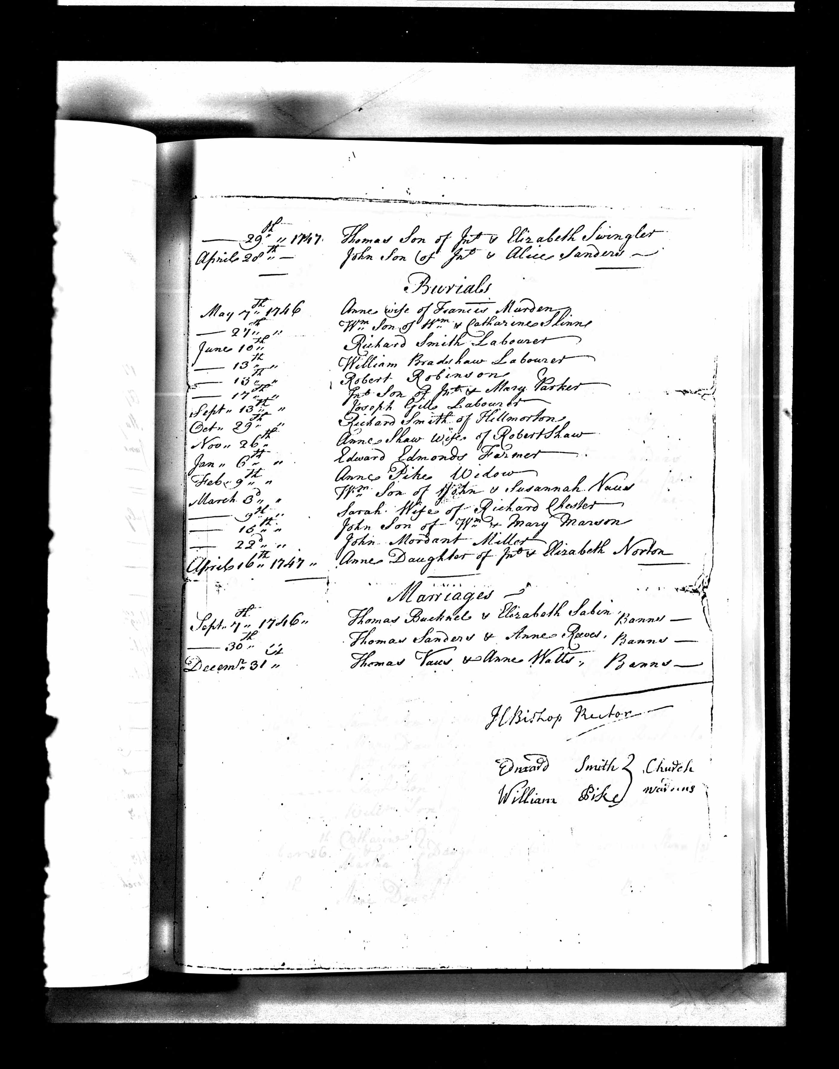 Bishop's Transcripts for the Diocese of Peterborough, England; Marriage entry for Thomas Bucknel and Elizabeth Sabin, 7 Sep 1746.