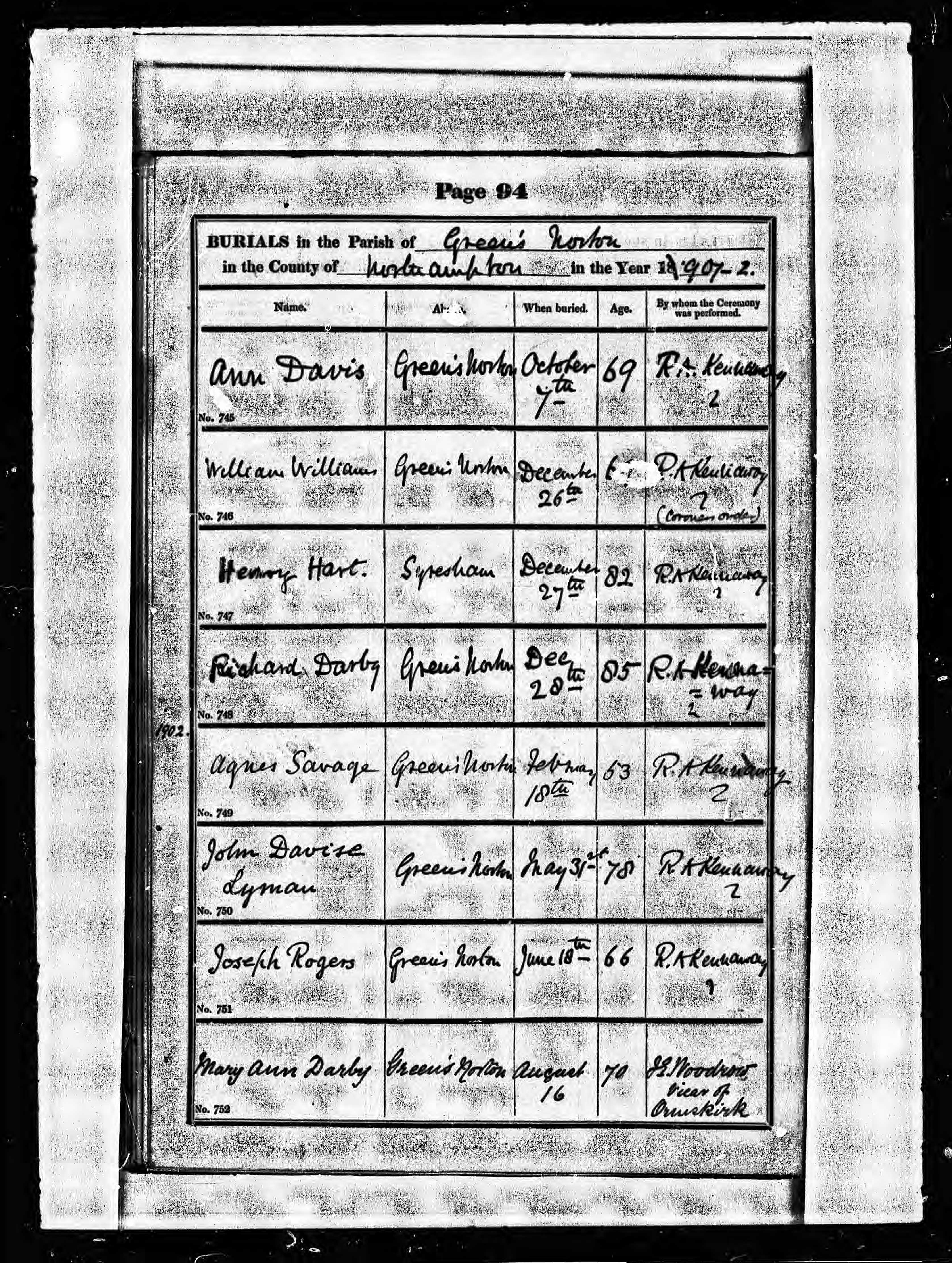 - Joseph Rogers★ was buried on 18 Jun, 1902 at St. Bartholomews Church, Greens Norton, Northamptonshire, England