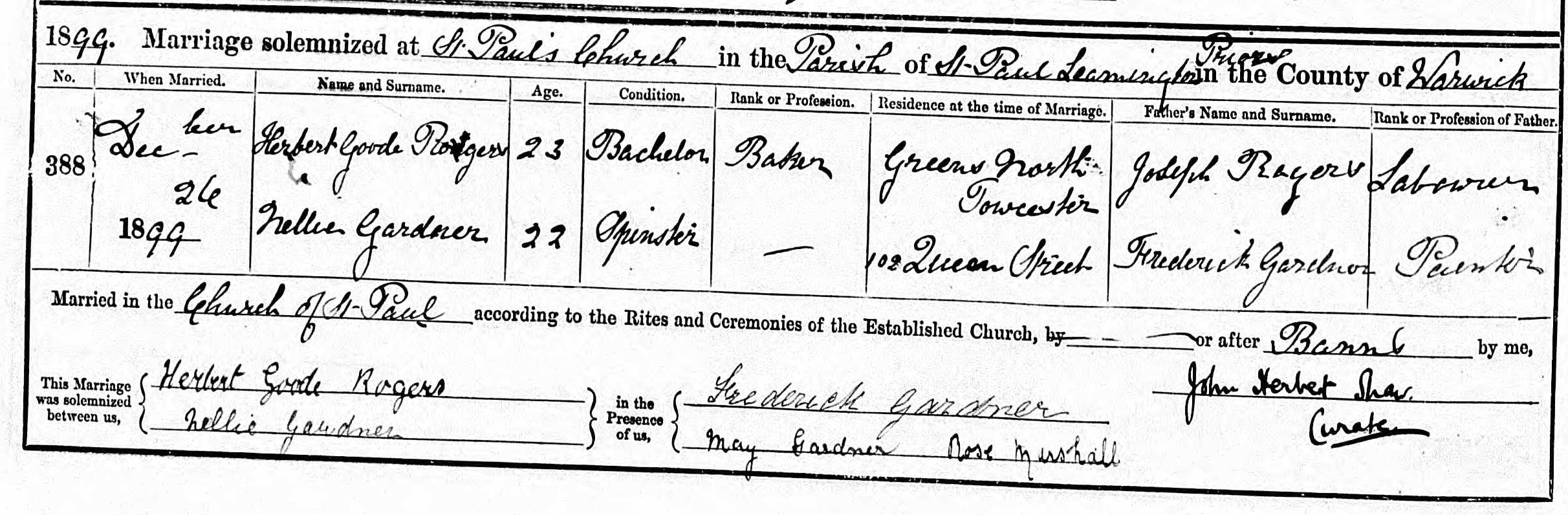 Parish Registers of St. Paul, Leamington Priors, Warwickshire; Marriage entry for Herbert Goode Rogers and Nellie Gardner, 26 Dec 1899, Page 194, No 388.