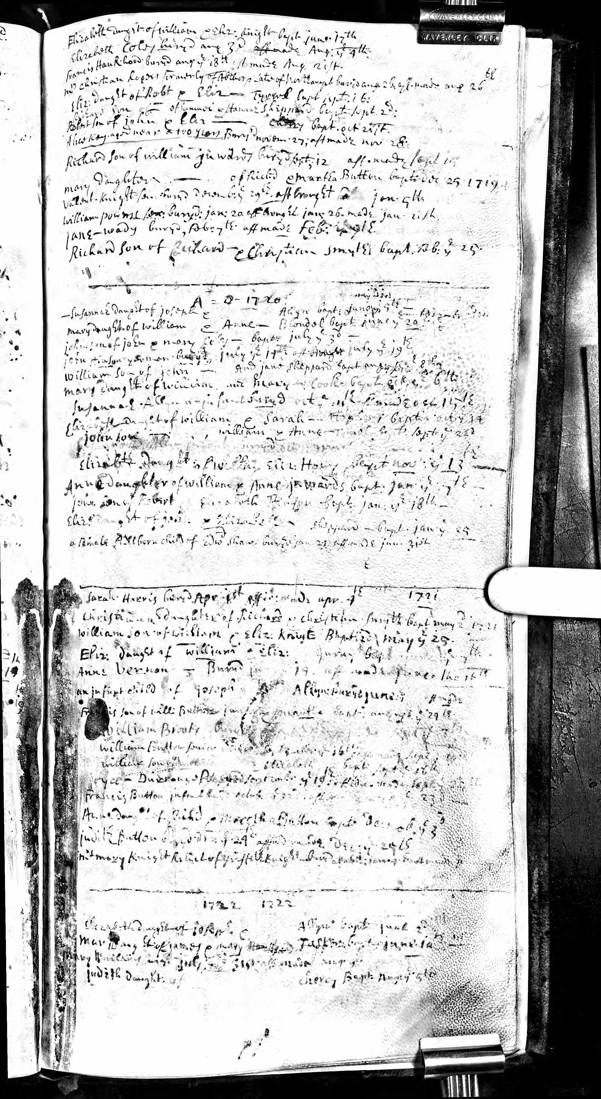 Parish Registers of St. John the Baptist, Abthorpe, Northamptonshire; Baptism entry for Elizabeth Hinson, 14 Oct 1720.