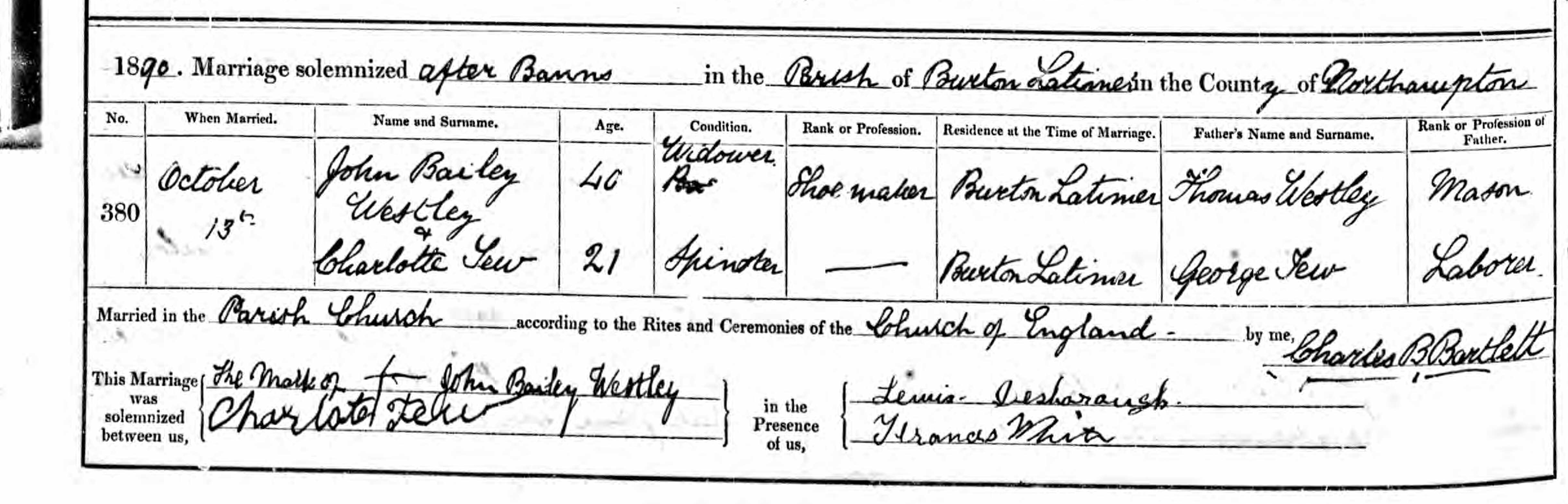 John Bailey Westley, 40, Widower, occupation Shoemaker, abode Burton Latimer and Charlotte Tew, 21, Spinster, abode Burton Latimer. Married by Banns. Groom's father: Thomas Westley, occupation Mason. Bride's father: George Tew, occupation Labourer. Groom could not sign name. Bride signed name. Witness: Lewis Desborough (signed). Witness: Frances White (signed).