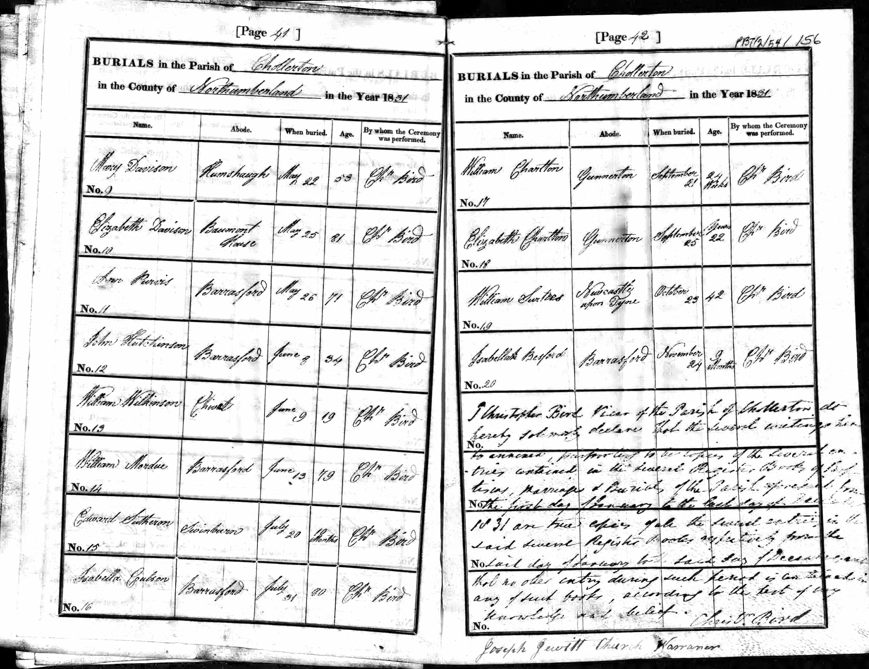 Bishop's Transcripts for the Diocese of Durham, England; Burial entry for William Mordue, Chollerton, 13 Jun 1831, Page 41, No14.