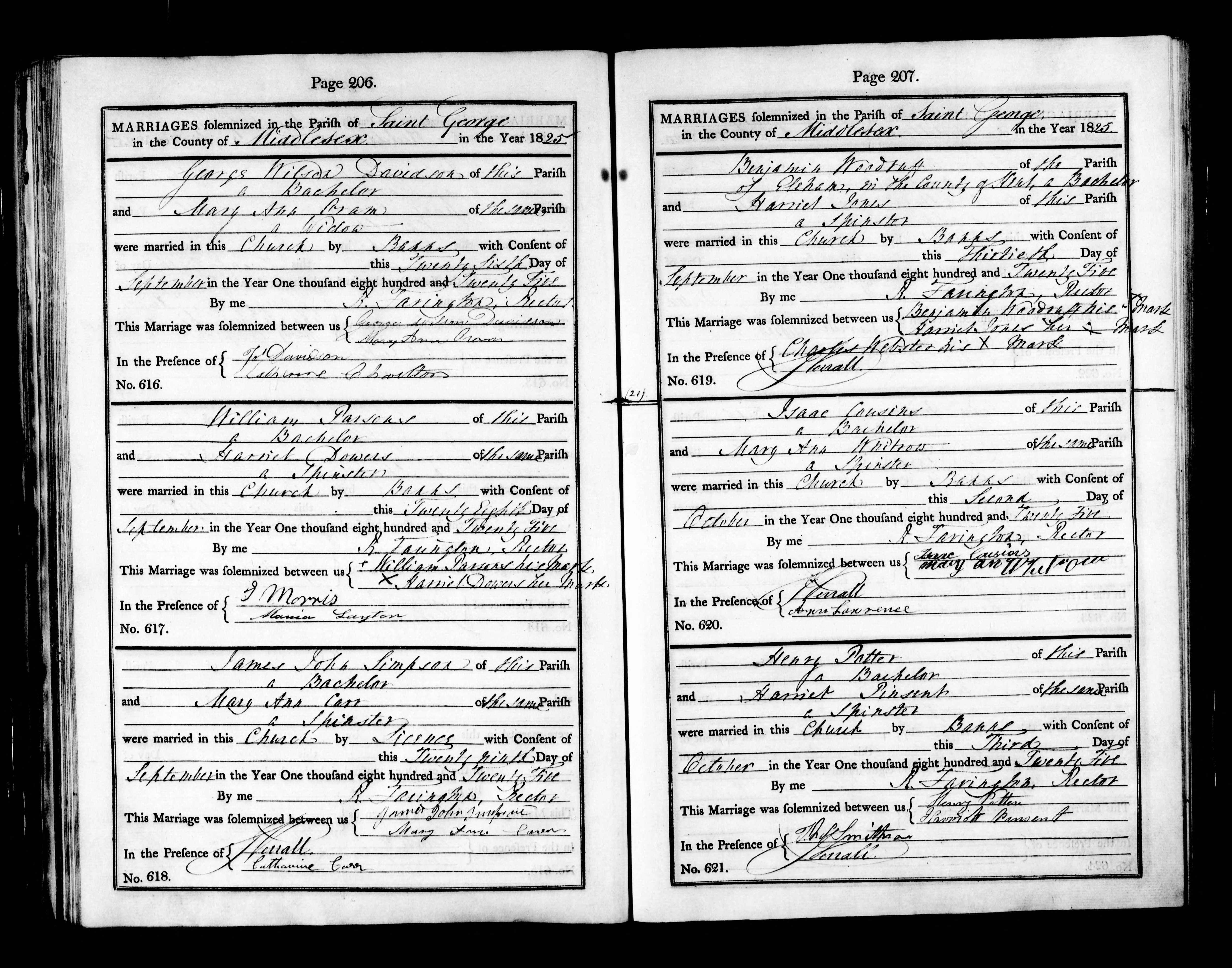 Parish Registers of St. George, St. George in the East, Middlesex; Marriage entry for James John Simpson and Mary Ann Carr, 29 Sep 1825, Page 206, No 618.