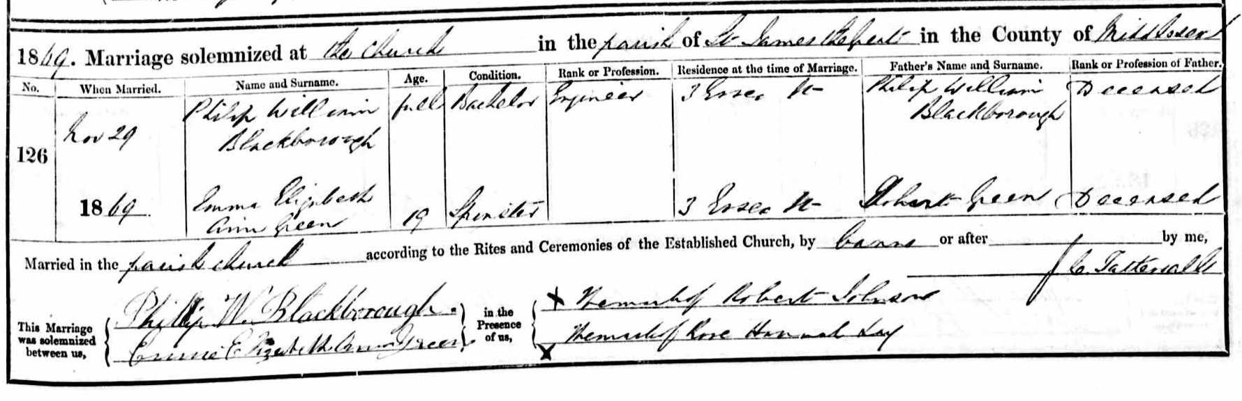 - Philip William Blackborough★ and Emma Elizabeth Ann Green★ was married on 29 Nov, 1869 at St. James' Church, Bethnal Green St. James the Great, Middlesex, England